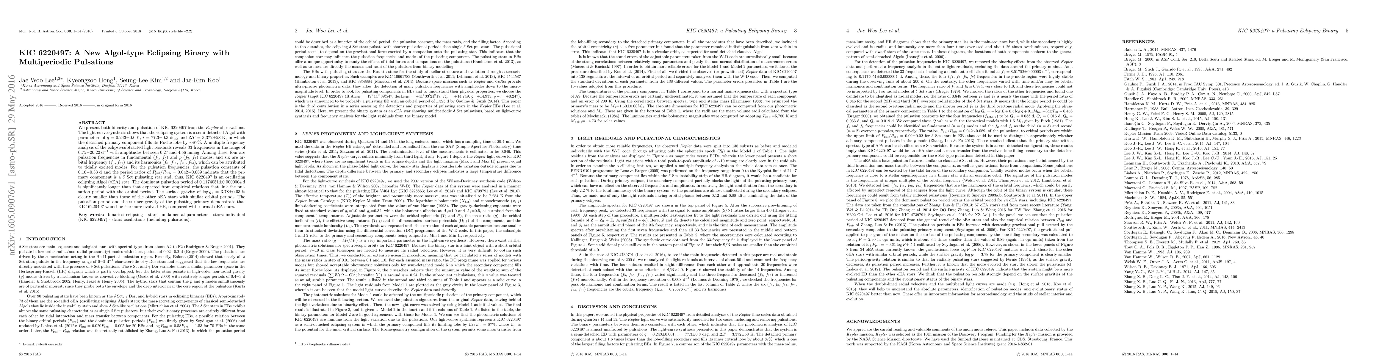 KIC 6220497 is identified as a new Algol-type eclipsing binary with multiperiodic pulsations, exhibiting a semi-detached configuration and showing 33 frequencies in its light curve, including four pulsation frequencies indicating it is a $\delta$ Sct pulsating star. The primary component's dominant pulsation period is longer than expected, suggesting it is more evolved than typical oscillating eclipsing Algol stars.
