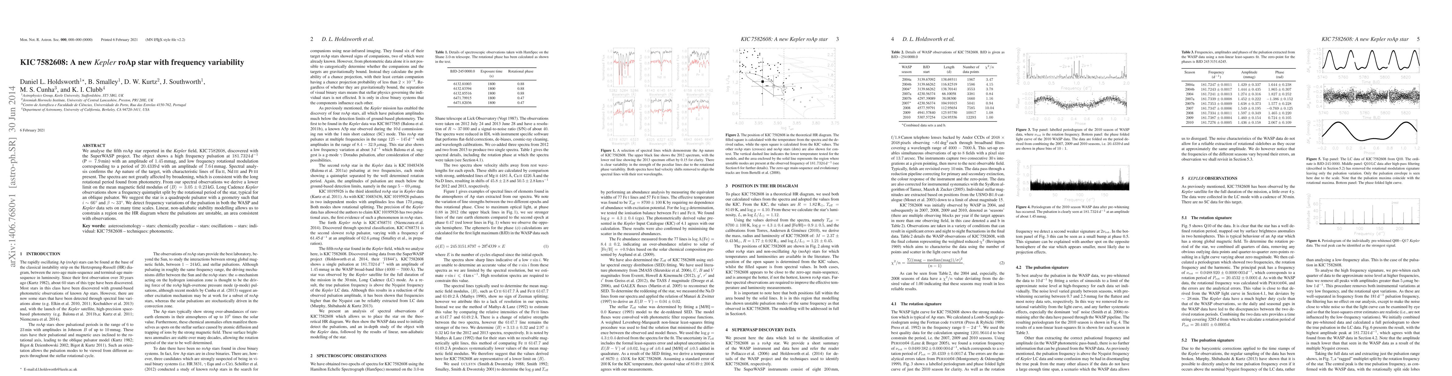 We analyse the fifth roAp star reported in the Kepler field, KIC 7582608, discovered with the SuperWASP project. The object shows a high frequency pulsation at 181.7324 d$^{-1}$ (P=7.9 min) with an amplitude of 1.45 mmag, and low frequency rotational modulation corresponding to a period of 20.4339 d with an amplitude of 7.64 mmag. Spectral analysis confirms the Ap nature of the target, with characteristic lines of Eu II, Nd III and Pr III present. The spectra are not greatly affected by broadening, which is consistent with the long rotational period found from photometry. From our spectral observations we derive a lower limit on the mean magnetic field modulus of = 3.05$\pm$0.23 kG. Long Cadence Kepler observations show a frequency quintuplet split by the rotational period of the star, typical for an oblique pulsator. We suggest the star is a quadrupole pulsator with a geometry such that $i\sim66^\circ$ and $\beta\sim33^\circ$. We detect frequency variations of the pulsation in both the WASP and Kepler data sets on many time scales. Linear, non-adiabatic stability modelling allows us to constrain a region on the HR diagram where the pulsations are unstable, an area consistent with observations.