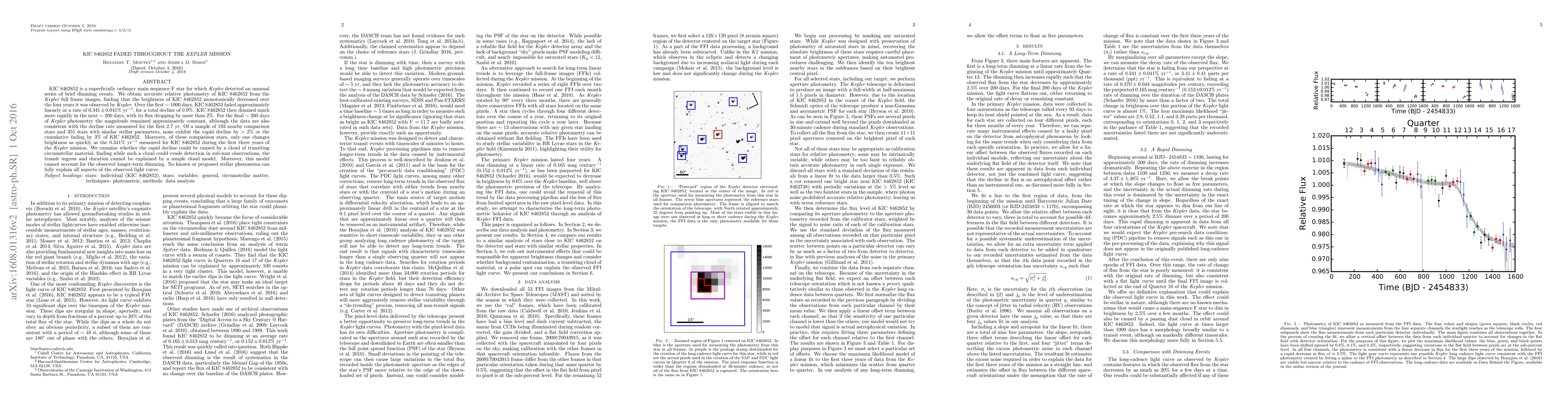 KIC 8462852, a main sequence F star, exhibited unusual dimming events during the Kepler mission, with its brightness decreasing by 0.9% over the first 1000 days and further dropping by 2% over the next 200 days. No similar stars in the sample show comparable dimming patterns, and proposed models for circumstellar material fail to fully explain the observed light curve.