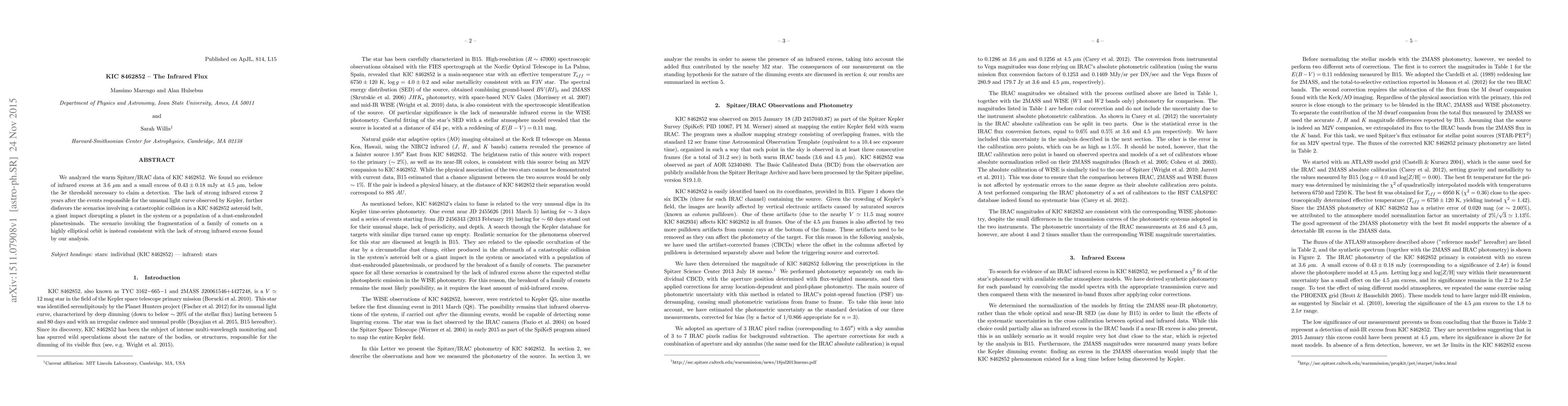We analyzed the warm Spitzer/IRAC data of KIC 8462852. We found no evidence of infrared excess at 3.6 micron and a small excess of 0.43 +/- 0.18 mJy at 4.5 micron, below the 3 sigma threshold necessary to claim a detection. The lack of strong infrared excess 2 years after the events responsible for the unusual light curve observed by Kepler, further disfavors the scenarios involving a catastrophic collision in a KIC 8462852 asteroid belt, a giant impact disrupting a planet in the system or a population of a dust-enshrouded planetesimals. The scenario invoking the fragmentation of a family of comets on a highly elliptical orbit is instead consistent with the lack of strong infrared excess found by our analysis.