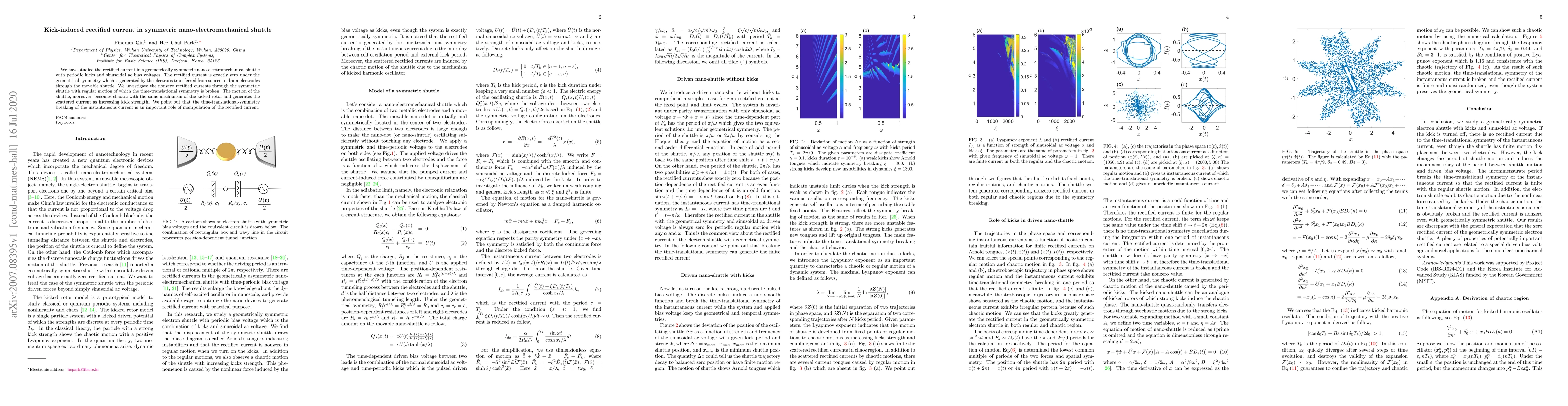 The paper presents a detailed analysis of a symmetric nano-electromechanical shuttle under periodic kicks and sinusoidal AC bias, demonstrating how symmetry breaking can lead to nonzero rectified currents.