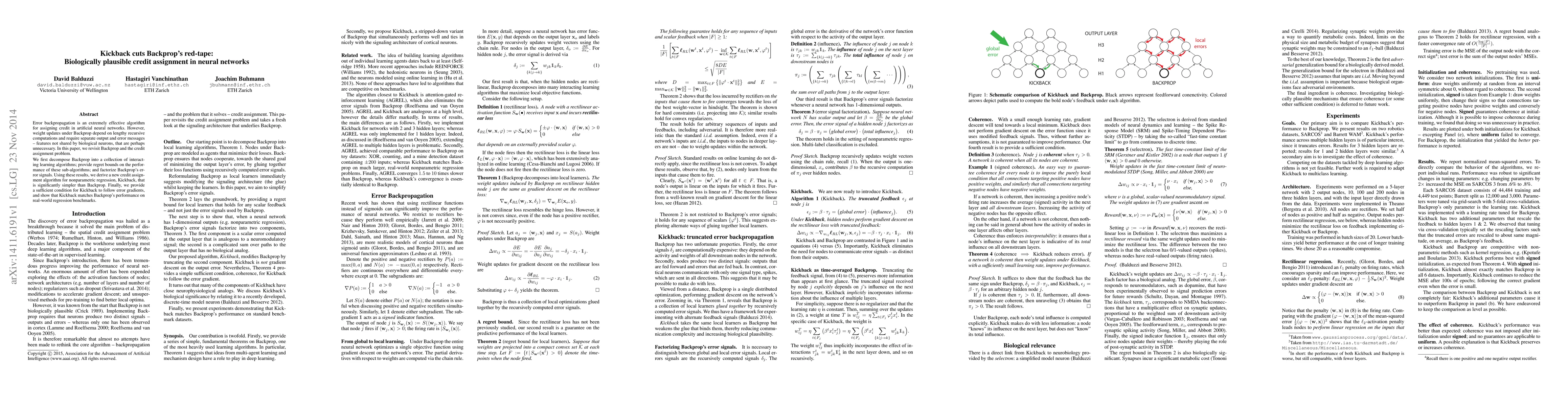 Error backpropagation is an extremely effective algorithm for assigning credit in artificial neural networks. However, weight updates under Backprop depend on lengthy recursive computations and require separate output and error messages -- features not shared by biological neurons, that are perhaps unnecessary. In this paper, we revisit Backprop and the credit assignment problem. We first decompose Backprop into a collection of interacting learning algorithms; provide regret bounds on the performance of these sub-algorithms; and factorize Backprop's error signals. Using these results, we derive a new credit assignment algorithm for nonparametric regression, Kickback, that is significantly simpler than Backprop. Finally, we provide a sufficient condition for Kickback to follow error gradients, and show that Kickback matches Backprop's performance on real-world regression benchmarks.