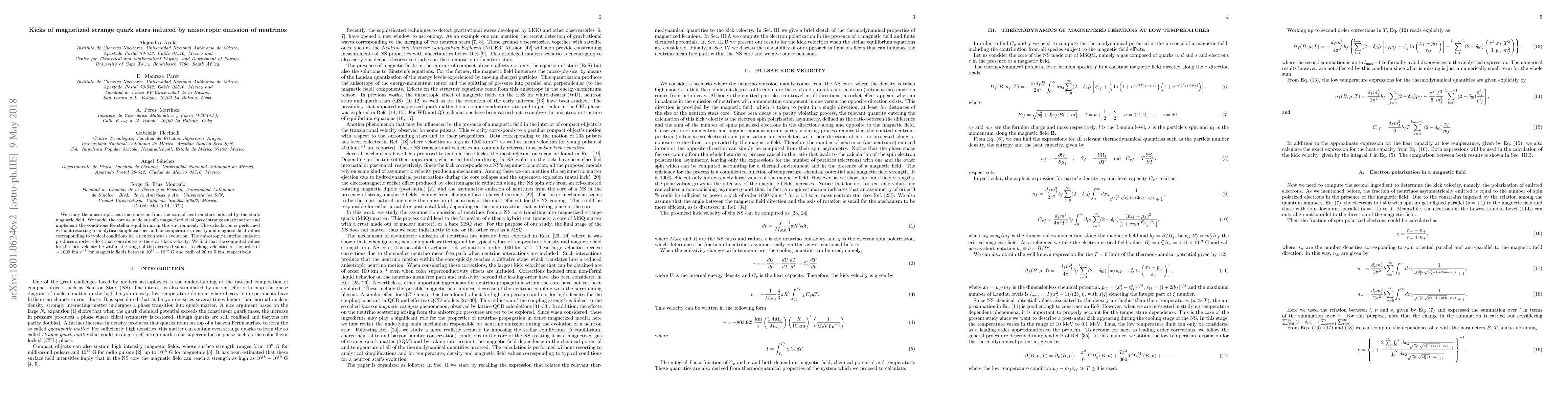This paper investigates the anisotropic neutrino emission from magnetized strange quark stars, modeling the core as a gas of strange quark matter. The study finds that this emission can induce significant kick velocities, up to ~1000 km s$^{-1}$, aligning with observed values for neutron stars.
