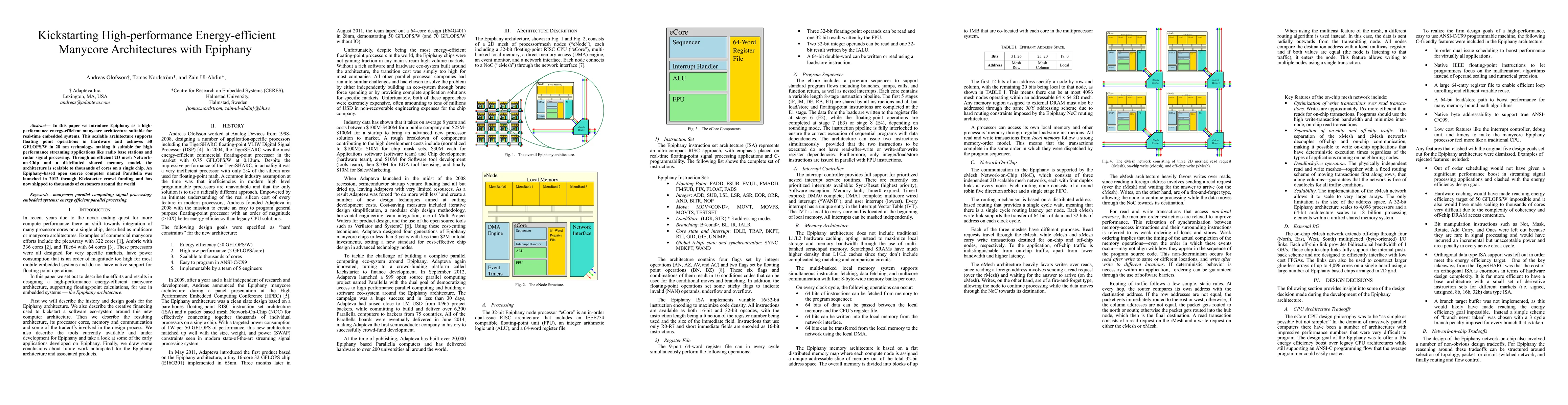 Epiphany is a high-performance energy-efficient manycore architecture that achieves 50 GFLOPS/W in 28 nm technology, suitable for real-time embedded systems and streaming applications.