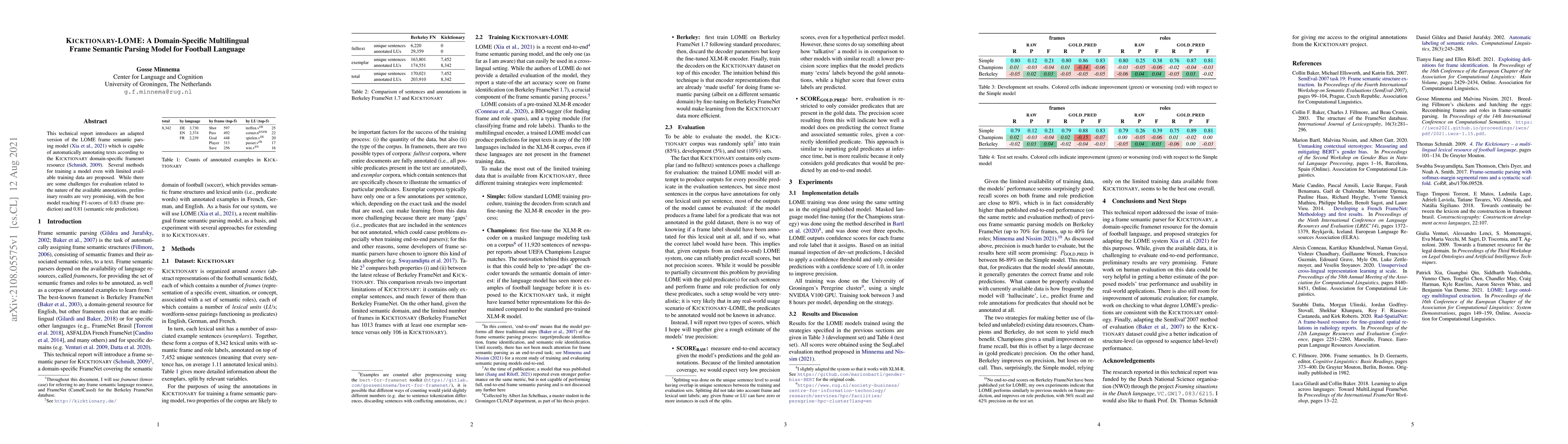 This technical report introduces an adapted version of the LOME frame semantic parsing model (Xia et al., EACL 2021) which is capable of automatically annotating texts according to the "Kicktionary" domain-specific framenet resource. Several methods for training a model even with limited available training data are proposed. While there are some challenges for evaluation related to the nature of the available annotations, preliminary results are very promising, with the best model reaching F1-scores of 0.83 (frame prediction) and 0.81 (semantic role prediction).
