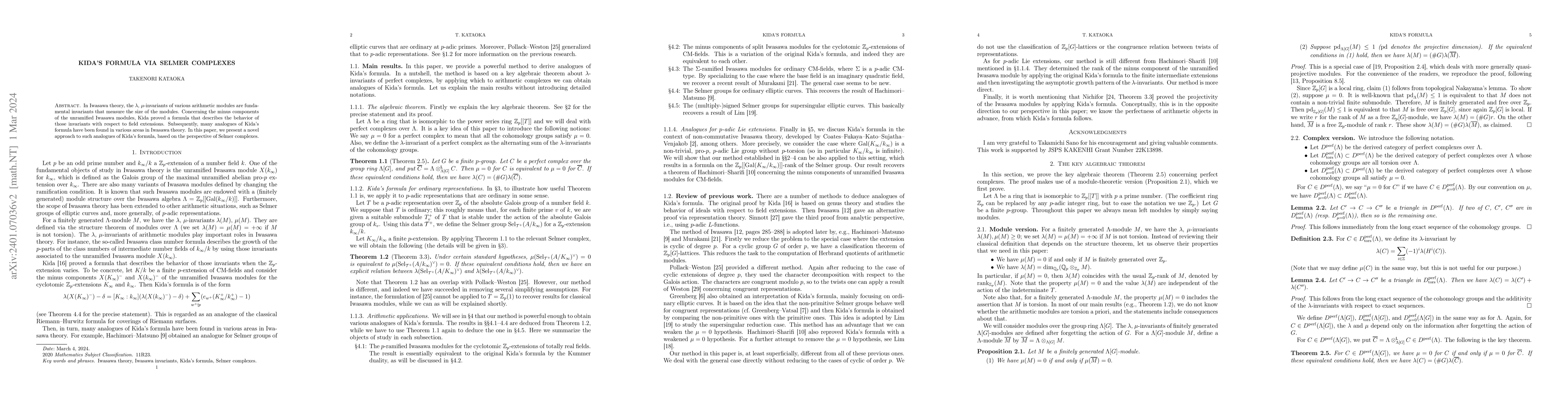 This paper presents a new method to derive analogues of Kida's formula in Iwasawa theory using Selmer complexes, providing a fresh perspective on the behavior of the $\lambda$, $\mu$-invariants in relation to field extensions. The approach leverages the structure of Selmer complexes to better understand these fundamental arithmetic invariants.