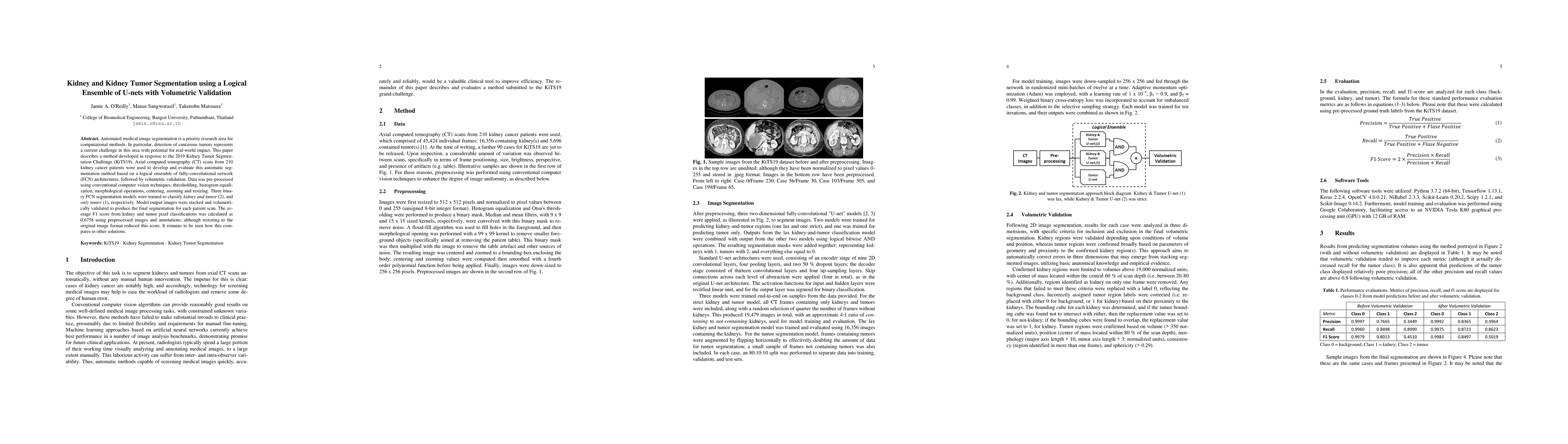 Automated medical image segmentation is a priority research area for computational methods. In particular, detection of cancerous tumors represents a current challenge in this area with potential for real-world impact. This paper describes a method developed in response to the 2019 Kidney Tumor Segmentation Challenge (KiTS19). Axial computed tomography (CT) scans from 210 kidney cancer patients were used to develop and evaluate this automatic segmentation method based on a logical ensemble of fully-convolutional network (FCN) architectures, followed by volumetric validation. Data was pre-processed using conventional computer vision techniques, thresholding, histogram equalization, morphological operations, centering, zooming and resizing. Three binary FCN segmentation models were trained to classify kidney and tumor (2), and only tumor (1), respectively. Model output images were stacked and volumetrically validated to produce the final segmentation for each patient scan. The average F1 score from kidney and tumor pixel classifications was calculated as 0.6758 using preprocessed images and annotations; although restoring to the original image format reduced this score. It remains to be seen how this compares to other solutions.