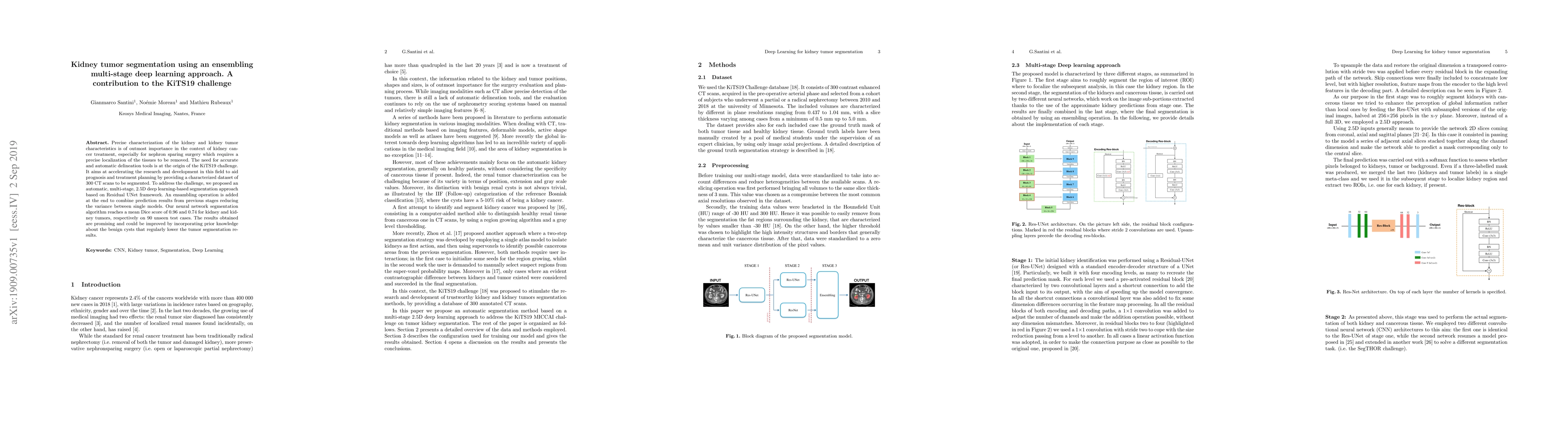 Precise characterization of the kidney and kidney tumor characteristics is of outmost importance in the context of kidney cancer treatment, especially for nephron sparing surgery which requires a precise localization of the tissues to be removed. The need for accurate and automatic delineation tools is at the origin of the KiTS19 challenge. It aims at accelerating the research and development in this field to aid prognosis and treatment planning by providing a characterized dataset of 300 CT scans to be segmented. To address the challenge, we proposed an automatic, multi-stage, 2.5D deep learning-based segmentation approach based on Residual UNet framework. An ensembling operation is added at the end to combine prediction results from previous stages reducing the variance between single models. Our neural network segmentation algorithm reaches a mean Dice score of 0.96 and 0.74 for kidney and kidney tumors, respectively on 90 unseen test cases. The results obtained are promising and could be improved by incorporating prior knowledge about the benign cysts that regularly lower the tumor segmentation results.