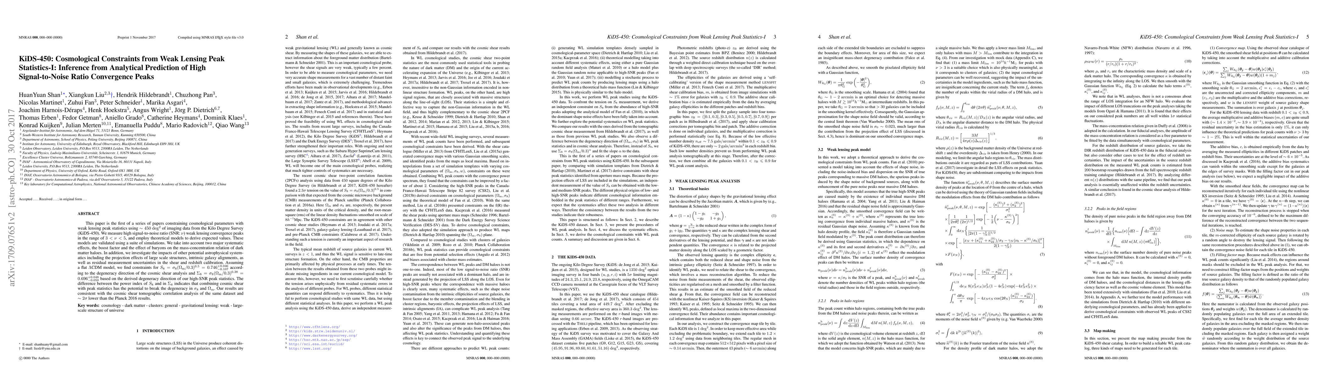 This paper is the first of a series of papers constraining cosmological parameters with weak lensing peak statistics using $\sim 450~\rm deg^2$ of imaging data from the Kilo Degree Survey (KiDS-450). We measure high signal-to-noise ratio (SNR: $\nu$) weak lensing convergence peaks in the range of $3<\nu<5$, and employ theoretical models to derive expected values. These models are validated using a suite of simulations. We take into account two major systematic effects, the boost factor and the effect of baryons on the mass-concentration relation of dark matter haloes. In addition, we investigate the impacts of other potential astrophysical systematics including the projection effects of large scale structures, intrinsic galaxy alignments, as well as residual measurement uncertainties in the shear and redshift calibration. Assuming a flat $\Lambda$CDM model, we find constraints for $S_{\rm 8}=\sigma_{\rm 8}(\Omega_{\rm m}/0.3)^{0.5}=0.746^{+0.046}_{-0.107}$ according to the degeneracy direction of the cosmic shear analysis and $\Sigma_{\rm 8}=\sigma_{\rm 8}(\Omega_{\rm m}/0.3)^{0.38}=0.696^{+0.048}_{-0.050}$ based on the derived degeneracy direction of our high-SNR peak statistics. The difference between the power index of $S_{\rm 8}$ and in $\Sigma_{\rm 8}$ indicates that combining the two probes has the potential to break the degeneracy in $\sigma_{\rm 8}$ and $\Omega_{\rm m}$. Our results are consistent with the cosmic shear tomographic correlation analysis of the same dataset and $\sim 2\sigma$ lower than the Planck 2016 results.