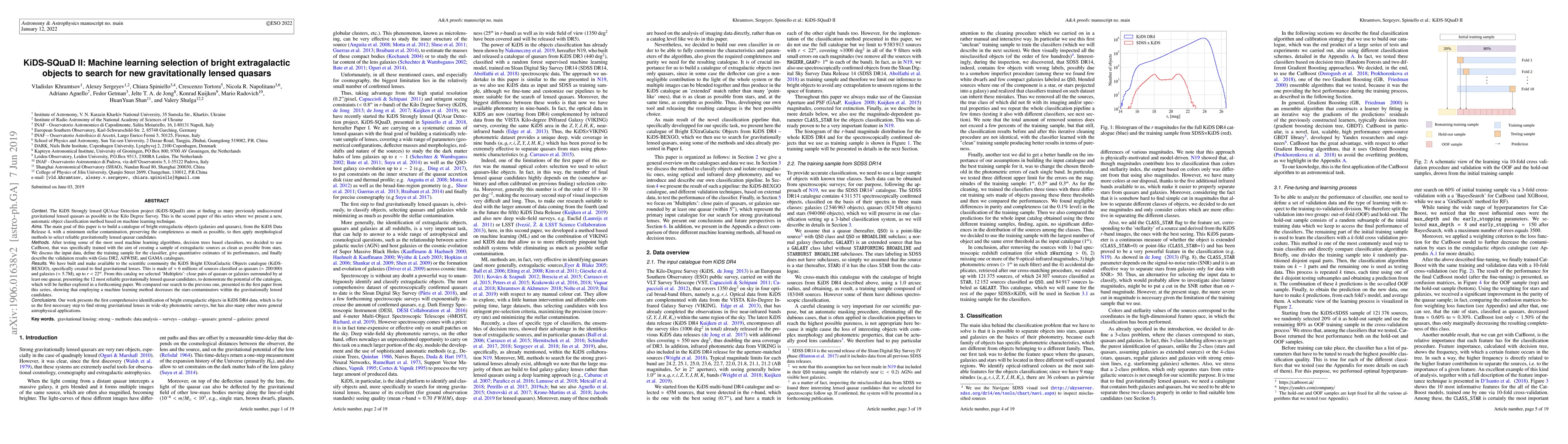The KiDS Strongly lensed QUAsar Detection project (KiDS-SQuaD) aims at finding as many previously undiscovered gravitational lensed quasars as possible in the Kilo Degree Survey. This is the second paper of this series where we present a new, automatic object classification method based on machine learning technique. The main goal of this paper is to build a catalogue of bright extragalactic objects (galaxies and quasars), from the KiDS Data Release 4, with a minimum stellar contamination, preserving the completeness as much as possible, to then apply morphological methods to select reliable gravitationally lensed (GL) quasar candidates. After testing some of the most used machine learning algorithms, decision trees based classifiers, we decided to use CatBoost, that was specifically trained with the aim of creating a sample of extragalactic sources as clean as possible from stars. We discuss the input data, define the training sample for the classifier, give quantitative estimates of its performances, and finally describe the validation results with Gaia DR2, AllWISE, and GAMA catalogues. We have built and make available to the scientific community the KiDS Bright EXtraGalactic Objects catalogue (KiDS-BEXGO), specifically created to find gravitational lenses. This is made of $\approx6$ millions of sources classified as quasars ($\approx 200\,000$) and galaxies ($\approx 5.7$M), up to $r<22^m$. From this catalog we selected 'Multiplets': close pairs of quasars or galaxies surrounded by at least one quasar, presenting the 12 most reliable gravitationally lensed quasar candidates, to demonstrate the potential of the catalogue, which will be further explored in a forthcoming paper. We compared our search to the previous one, presented in the first paper from this series, showing that employing a machine learning method decreases the stars-contaminators within the GL candidates.