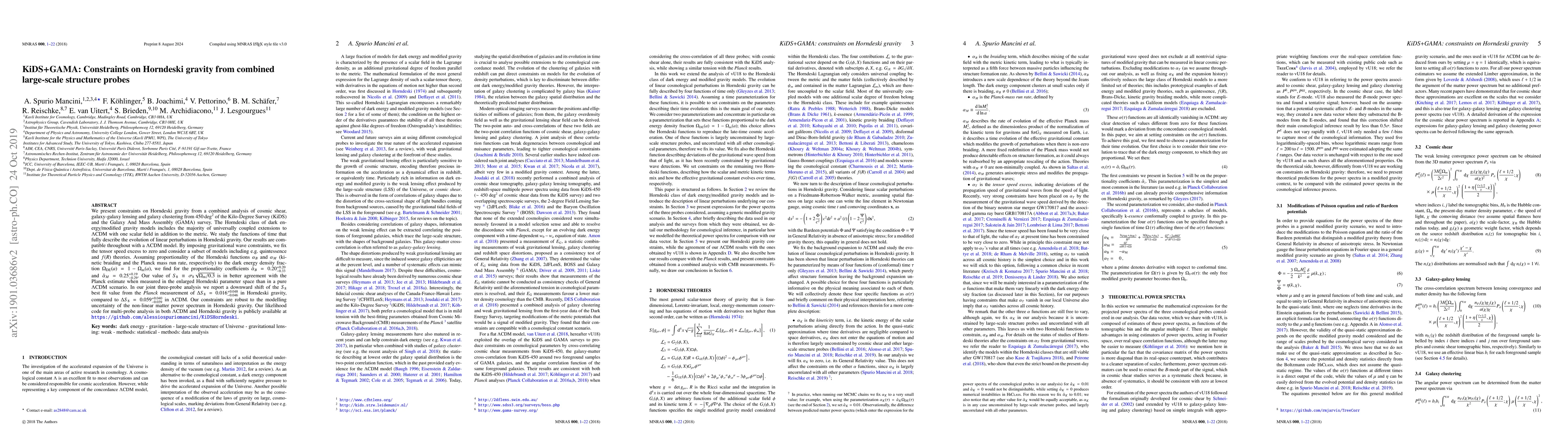 This paper combines cosmic shear, galaxy-galaxy lensing, and galaxy clustering data from the KiDS and GAMA surveys to constrain Horndeski gravity models, finding results compatible with $\Lambda$CDM. The study reports a downward shift in $S_8$ compared to Planck estimates, suggesting better agreement in the Horndeski framework.