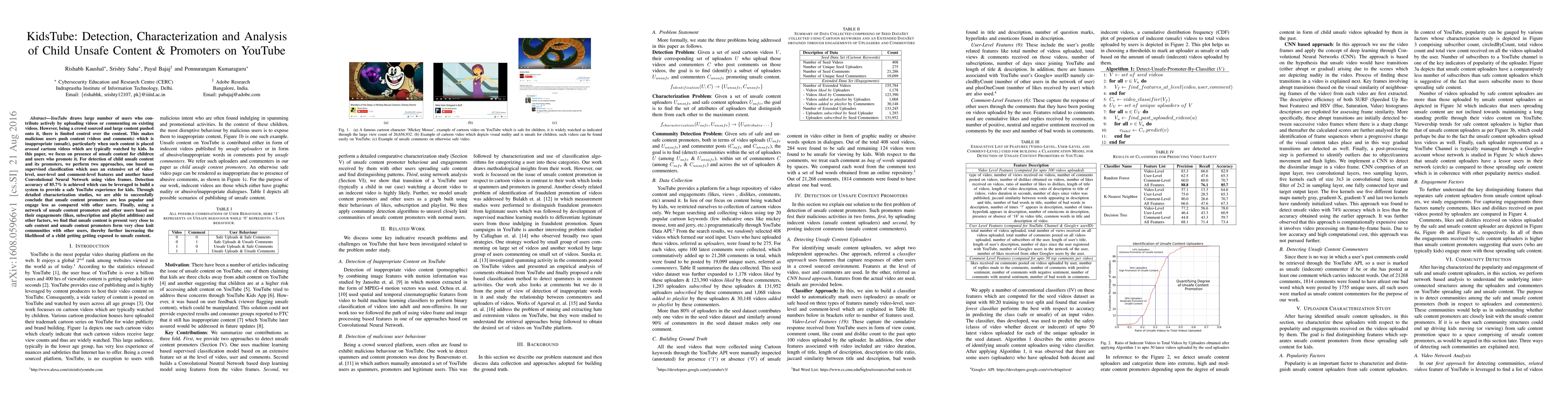 YouTube draws large number of users who contribute actively by uploading videos or commenting on existing videos. However, being a crowd sourced and large content pushed onto it, there is limited control over the content. This makes malicious users push content (videos and comments) which is inappropriate (unsafe), particularly when such content is placed around cartoon videos which are typically watched by kids. In this paper, we focus on presence of unsafe content for children and users who promote it. For detection of child unsafe content and its promoters, we perform two approaches, one based on supervised classification which uses an extensive set of video-level, user-level and comment-level features and another based Convolutional Neural Network using video frames. Detection accuracy of 85.7% is achieved which can be leveraged to build a system to provide a safe YouTube experience for kids. Through detailed characterization studies, we are able to successfully conclude that unsafe content promoters are less popular and engage less as compared with other users. Finally, using a network of unsafe content promoters and other users based on their engagements (likes, subscription and playlist addition) and other factors, we find that unsafe content is present very close to safe content and unsafe content promoters form very close knit communities with other users, thereby further increasing the likelihood of a child getting getting exposed to unsafe content.