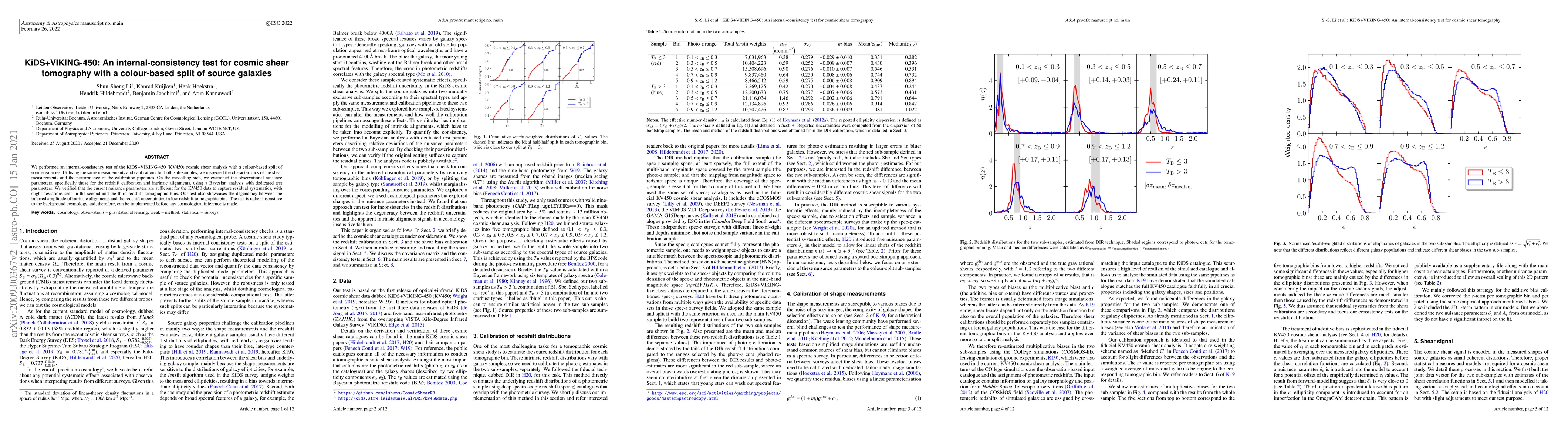 This paper conducts an internal-consistency test for the KiDS+VIKING-450 cosmic shear analysis, using colour-based splits of source galaxies. The study confirms the adequacy of current calibration methods and identifies slight deviations in higher redshift bins, while highlighting the degeneracy between intrinsic alignments and redshift uncertainties.