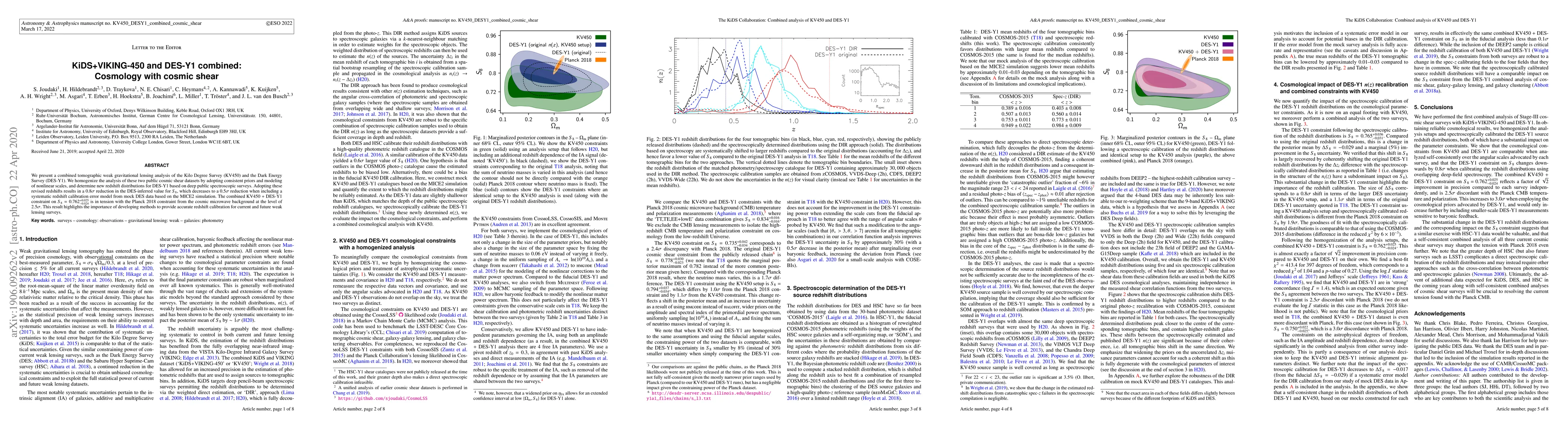This paper combines cosmic shear data from the KiDS+VIKING-450 and DES-Y1 surveys to improve cosmological parameter constraints, particularly $S_8$. The analysis reveals a $0.8\sigma$ reduction in $S_8$ when recalibrating DES-Y1 redshifts, leading to a $2.5\sigma$ tension with Planck 2018 results, underscoring the need for precise redshift calibration.