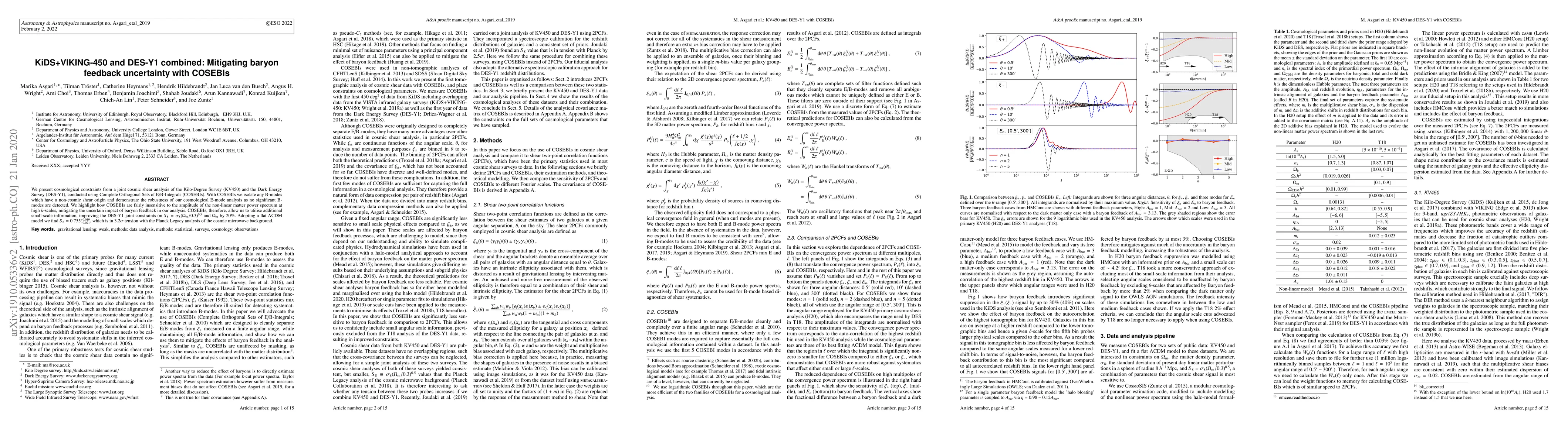 This paper combines cosmic shear data from KiDS+VIKING-450 and DES-Y1 using COSEBIs to derive cosmological constraints, showing robustness against B-modes and mitigating the impact of baryon feedback. The analysis improves constraints on $S_8$ and $\Omega_{\rm m}$ by 20%, finding $S_8=0.755^{+0.019}_{-0.021}$, which is in tension with Planck results.