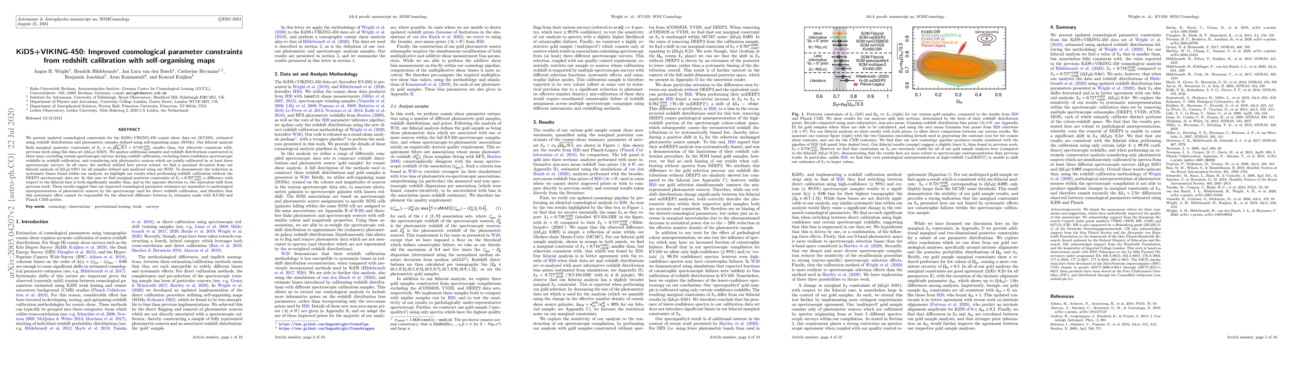 This study uses a self-organising map to improve cosmological parameter constraints from redshift calibration in the KiDS+VIKING-450 cosmic shear data set, finding smaller constraints than previous work with minimal deviation.