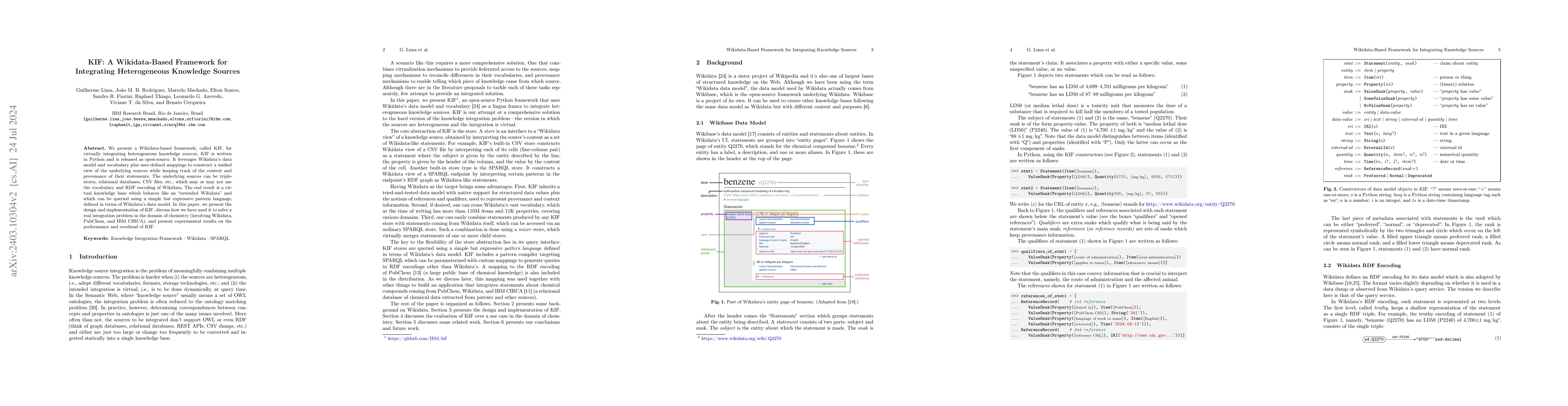 Summary: KIF is a framework for integrating diverse knowledge bases using Wikidata as a standard, allowing heterogeneous data sources to be queried uniformly. It achieves this through user-defined mappings and maintains context and provenance, enabling efficient querying via filters or SPARQL, demonstrated through a chemistry domain integration case study.