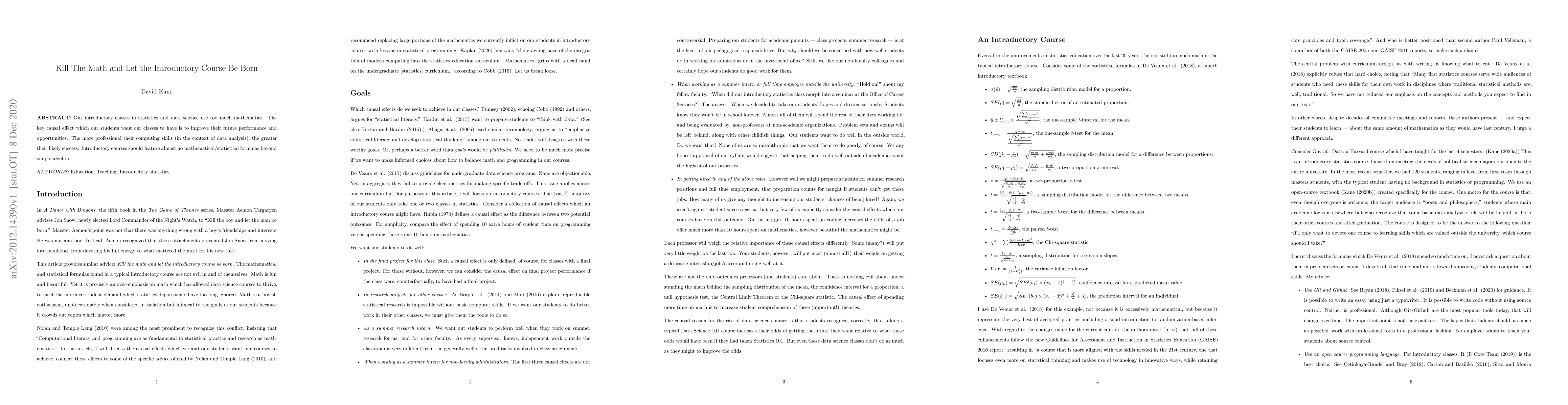 Our introductory classes in statistics and data science use too much mathematics. The key causal effect which our students want our classes to have is to improve their future performance and opportunities. The more professional their computing skills (in the context of data analysis), the greater their likely success. Introductory courses should feature almost no mathematical/statistical formulas beyond simple algebra.