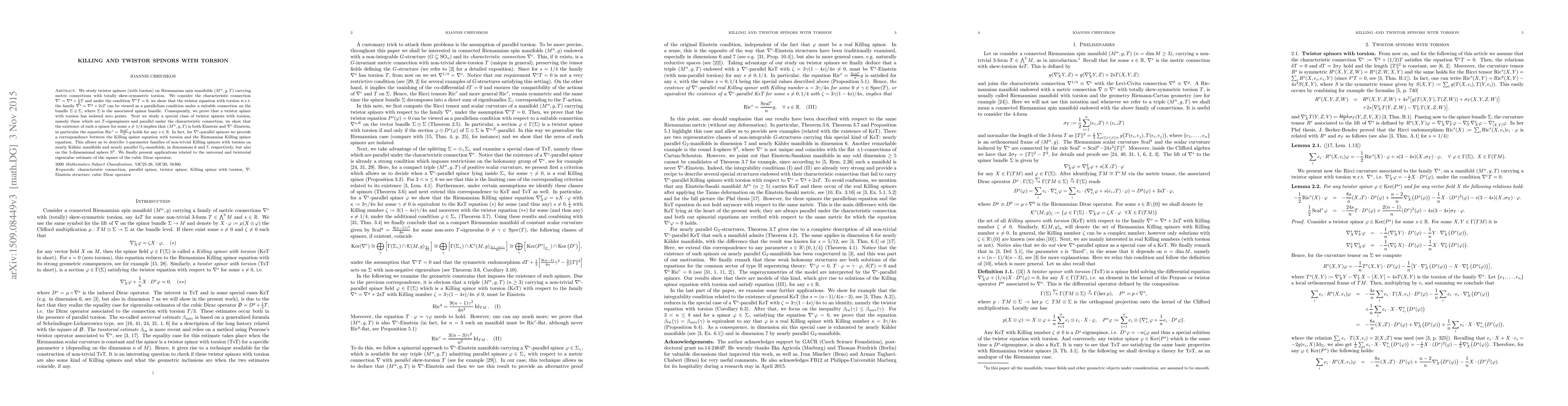 We study twistor spinors (with torsion) on Riemannian spin manifolds $(M^{n}, g, T)$ carrying metric connections with totally skew-symmetric torsion. We consider the characteristic connection $\nabla^{c}=\nabla^{g}+\frac{1}{2}T$ and under the condition $\nabla^{c}T=0$, we show that the twistor equation with torsion w.r.t. the family $\nabla^{s}=\nabla^{g}+2sT$ can be viewed as a parallelism condition under a suitable connection on the bundle $\Sigma\oplus\Sigma$, where $\Sigma$ is the associated spinor bundle. Consequently, we prove that a twistor spinor with torsion has isolated zero points. Next we study a special class of twistor spinors with torsion, namely these which are $T$-eigenspinors and parallel under the characteristic connection; we show that the existence of such a spinor for some $s\neq 1/4$ implies that $(M^{n}, g, T)$ is both Einstein and $\nabla^{c}$-Einstein, in particular the equation ${\rm Ric}^{s}=\frac{{\rm Scal}^{s}}{n}g$ holds for any $s\in\mathbb{R}$. In fact, for $\nabla^{c}$-parallel spinors we provide a correspondence between the Killing spinor equation with torsion and the Riemannian Killing spinor equation. This allows us to describe 1-parameter families of non-trivial Killing spinors with torsion on nearly K\"ahler manifolds and nearly parallel ${\rm G}_2$-manifolds, in dimensions 6 and 7, respectively, but also on the 3-dimensional sphere ${\rm S}^{3}$. We finally present applications related to the universal and twistorial eigenvalue estimate of the square of the cubic Dirac operator.
