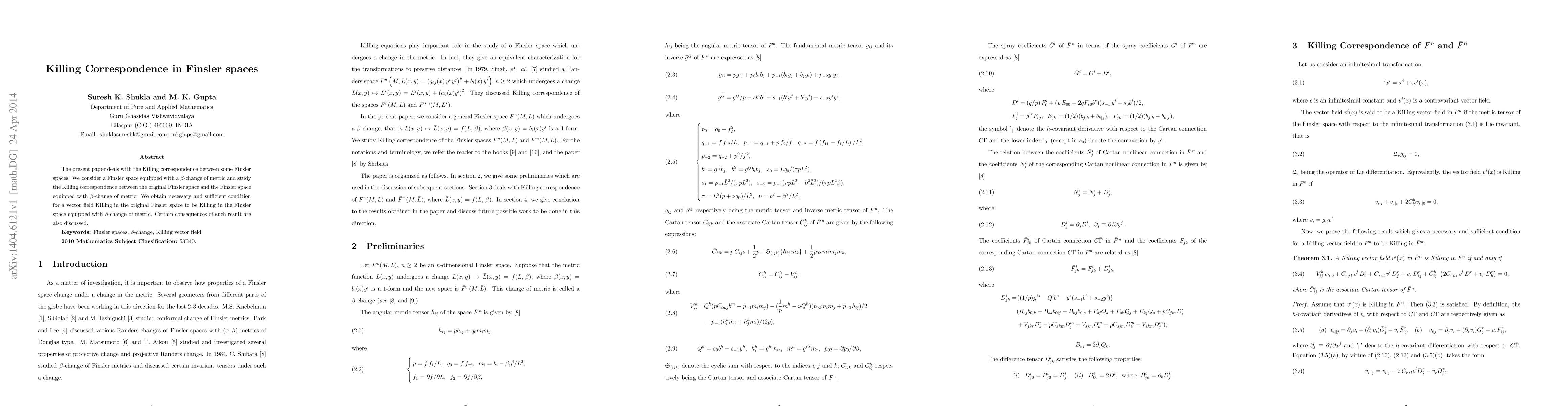 The present paper deals with the Killing correspondence between some Finsler spaces. We consider a Finsler space equipped with a $\beta$-change of metric and study the Killing correspondence between the original Finsler space and the Finsler space equipped with $\beta$-change of metric. We obtain necessary and sufficient condition for a vector field Killing in the original Finsler space to be Killing in the Finsler space equipped with $\beta$-change of metric. Certain consequences of such result are also discussed.