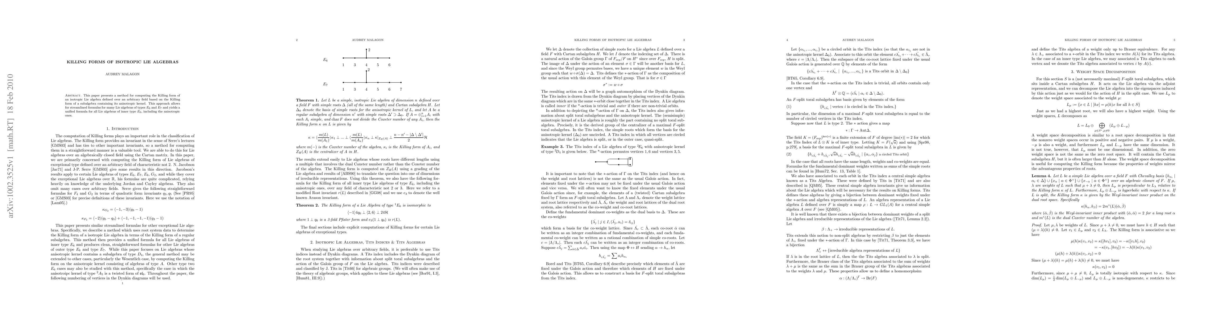 This paper presents a method for computing the Killing form of an isotropic Lie algebra defined over an arbitrary field based on the Killing form of a subalgebra containing its anisotropic kernel. This approach allows for streamlined formulas for many Lie algebras of types E6 and E7 and yields a unified formula for all Lie algebras of inner type E6, including the anisotropic ones.