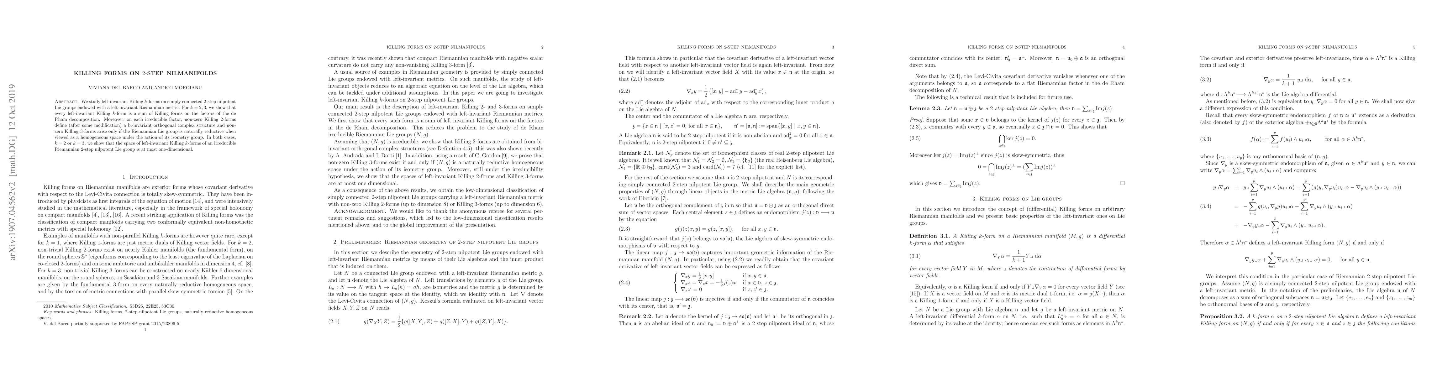 Summary: This paper investigates left-invariant Killing forms on simply connected 2-step nilpotent Lie groups with a Riemannian metric, demonstrating that Killing forms of degree 2 and 3 decompose into forms on the factors of the de Rham decomposition. It concludes that the space of Killing forms for irreducible factors is at most one-dimensional, with special conditions for Killing 3-forms.