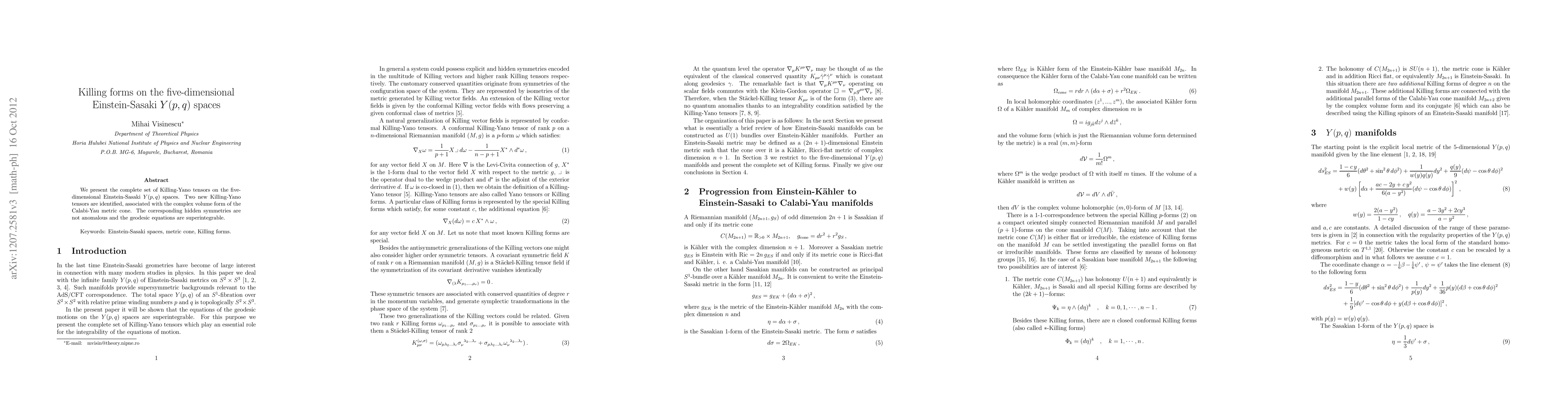 This paper identifies two new Killing-Yano tensors on five-dimensional Einstein-Sasaki Y(p,q) spaces, associated with the complex volume form of the Calabi-Yau metric cone, revealing hidden symmetries that lead to superintegrable geodesic equations.