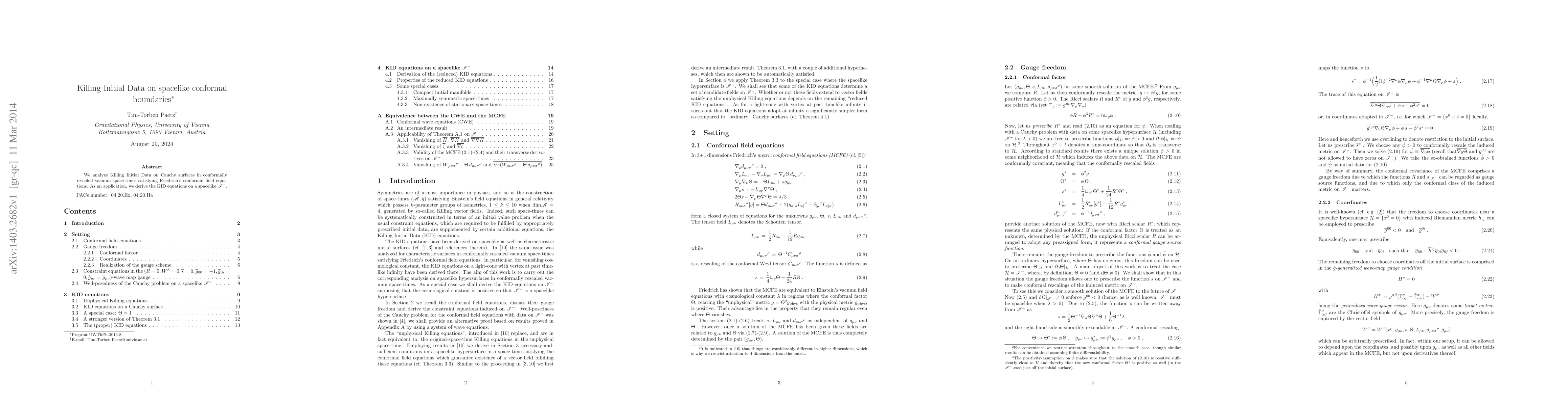 Summary: This paper investigates Killing Initial Data on Cauchy surfaces in conformally rescaled vacuum spacetimes, deriving the KID equations specifically on a spacelike past boundary ($\mathcal{J}^-$) and applying Friedrich's conformal field equations.