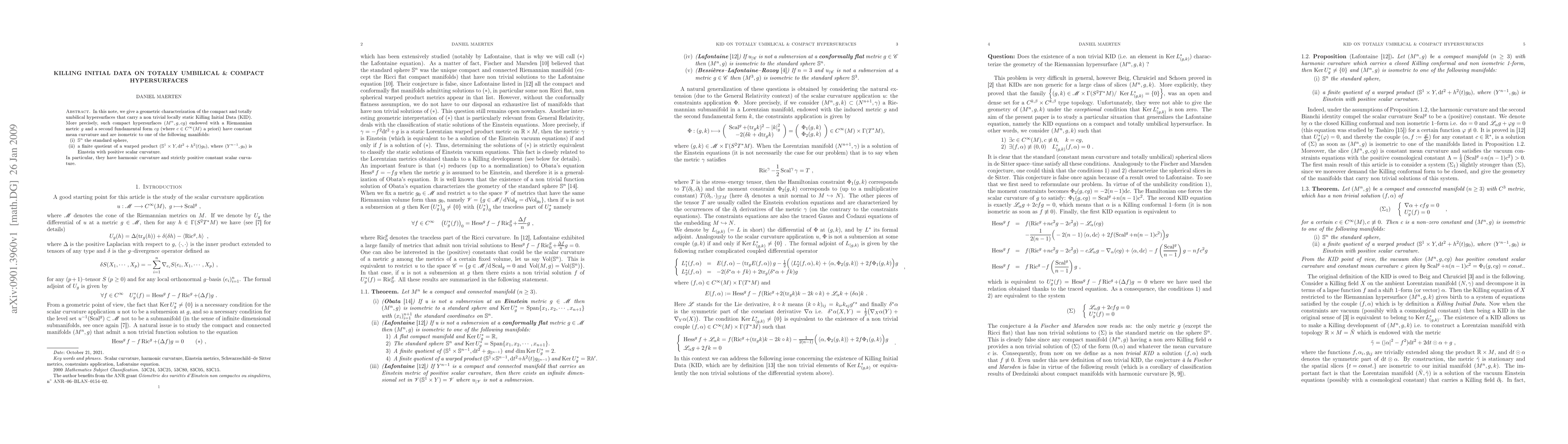 In this note, we give a geometric characterization of the compact and totally umbilical hypersurfaces that carry a non trivial locally static Killing Initial Data (KID). More precisely, such compact hypersurfaces have constant mean curvature and are isometric to one of the following manifolds: (i) Sn the standard sphere, (ii) a finite quotient of a warped product of a circle with a compact Einstein manifold of positive scalar curvature. In particular, these hypersurfaces have harmonic curvature and strictly positive constant scalar curvature.