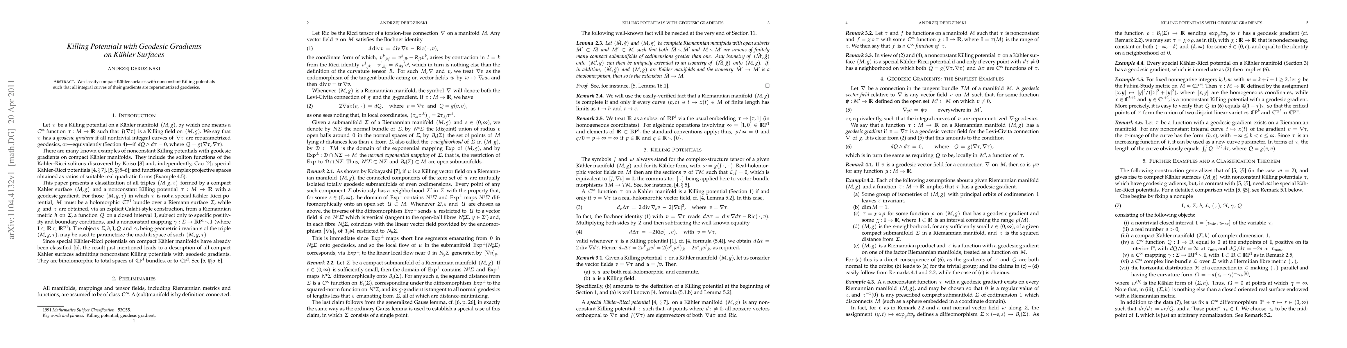 This paper classifies compact K"ahler surfaces with specific properties that relate to their geodesic gradients, shedding light on the relationship between Killing potentials and geodesics.