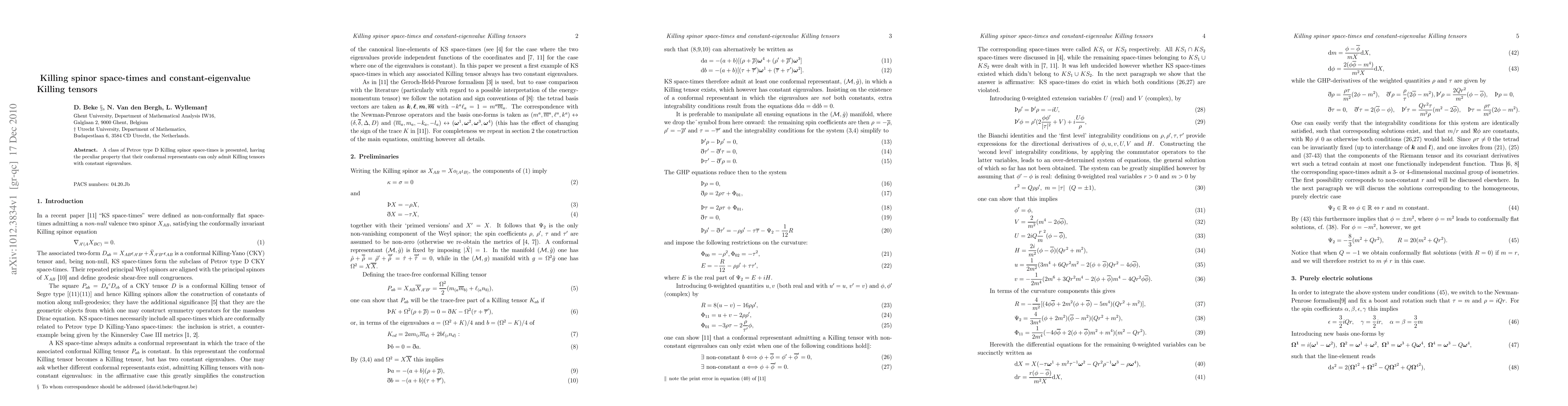 Summary: The paper introduces a unique class of Petrov type D Killing spinor space-times where conformal representatives only allow Killing tensors with constant eigenvalues, highlighting a distinctive property of these spacetimes.