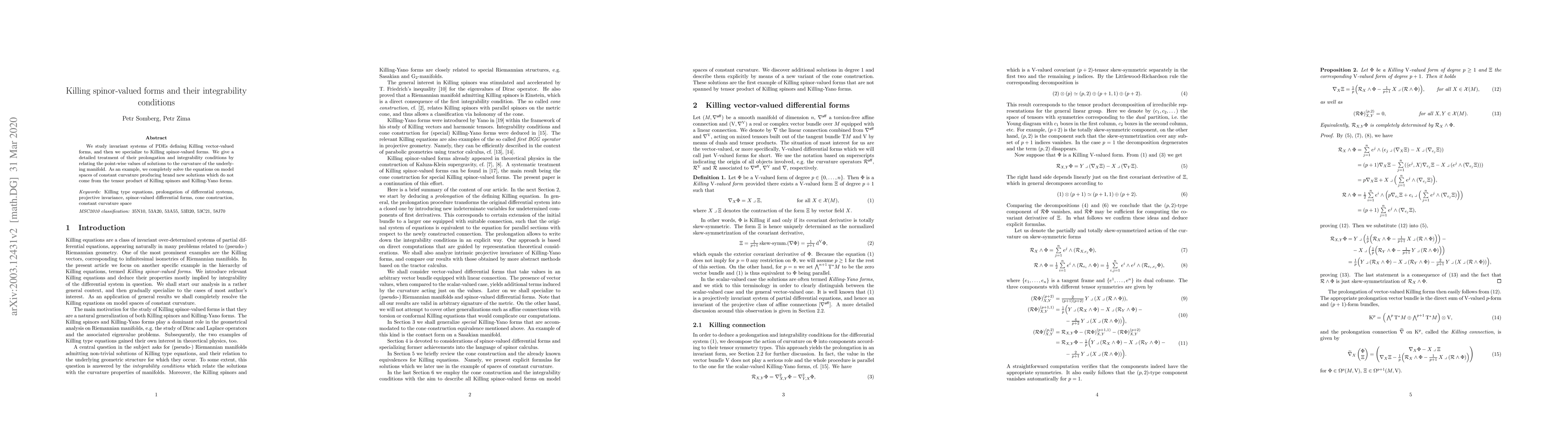 We study invariant systems of PDEs defining Killing vector-valued forms, and then we specialize to Killing spinor-valued forms. We give a detailed treatment of their prolongation and integrability conditions by relating the point-wise values of solutions to the curvature of the underlying manifold. As an example, we completely solve the equations on model spaces of constant curvature producing brand new solutions which do not come from the tensor product of Killing spinors and Killing-Yano forms.