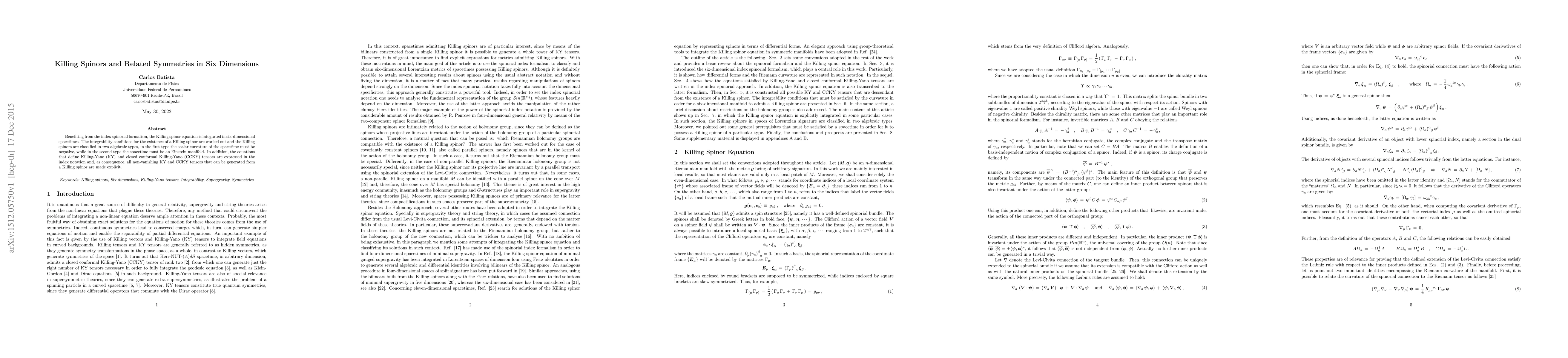 Benefiting from the index spinorial formalism, the Killing spinor equation is integrated in six-dimensional spacetimes. The integrability conditions for the existence of a Killing spinor are worked out and the Killing spinors are classified in two algebraic types, in the first type the scalar curvature of the spacetime must be negative, while in the second type the spacetime must be an Einstein manifold. In addition, the equations that define Killing-Yano (KY) and closed conformal Killing-Yano (CCKY) tensors are expressed in the index notation and, as consequence, all non-vanishing KY and CCKY tensors that can be generated from a Killing spinor are made explicit.