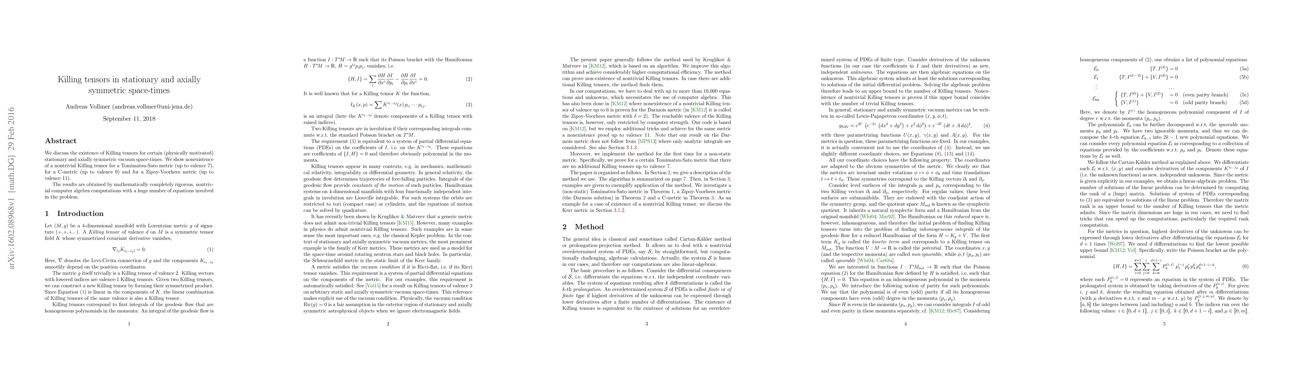 We discuss the existence of Killing tensors for certain (physically motivated) stationary and axially symmetric vacuum space-times. We show nonexistence of a nontrivial Killing tensor for a Tomimatsu-Sato metric (up to valence 7), for a C-metric (up to valence 9) and for a Zipoy-Voorhees metric (up to valence 11). The results are obtained by mathematically completely rigorous, nontrivial computer algebra computations with a huge number of equations involved in the problem.