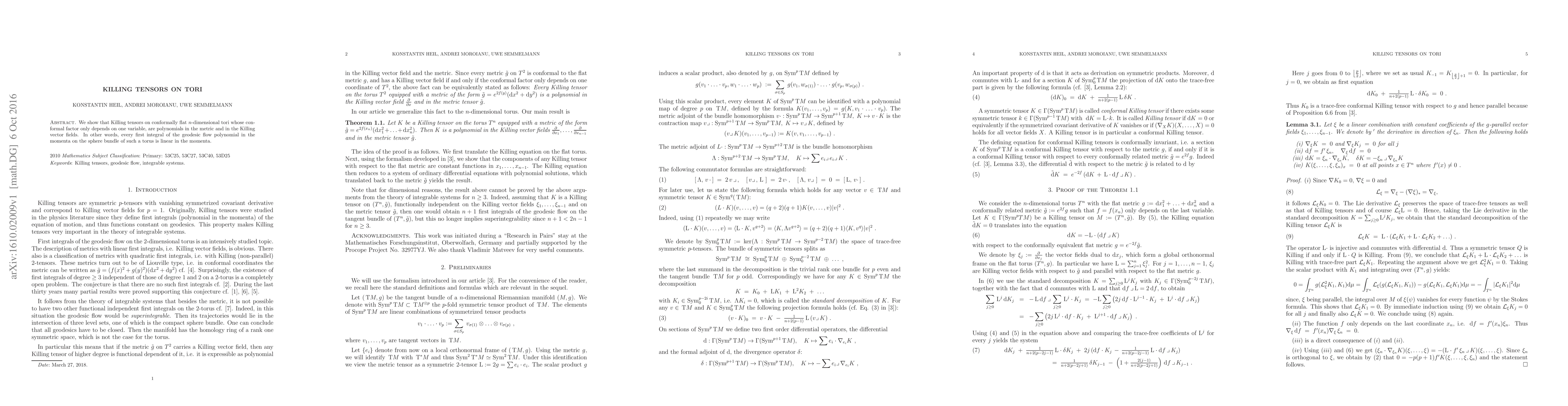 Summary: This paper demonstrates that Killing tensors on specific $n$-dimensional tori are polynomial in the metric and Killing vector fields, and every first integral of the geodesic flow on these tori is linear in the momenta. This result applies to conformally flat tori with a conformal factor dependent on one variable.