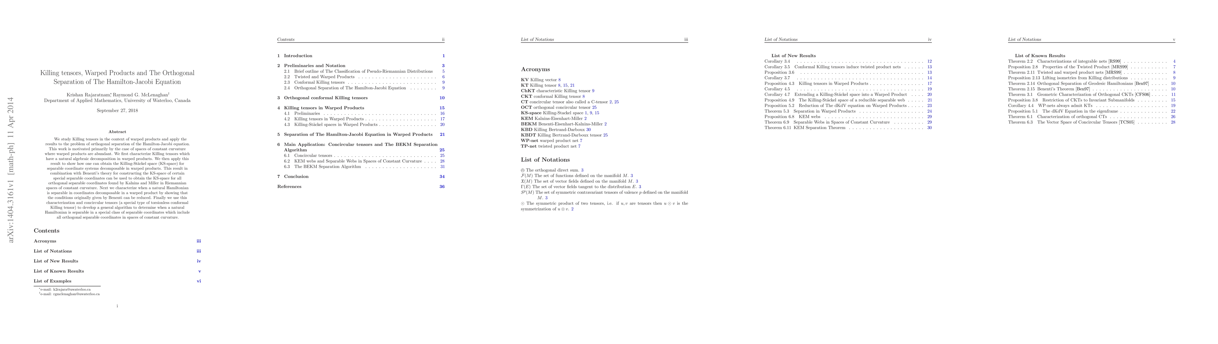 This paper investigates Killing tensors within warped products and demonstrates their application to the orthogonal separation of the Hamilton-Jacobi equation. It develops a method to obtain Killing-Stackel spaces for separable coordinate systems in spaces of constant curvature, extending Benenti's theory to cover all orthogonal separable coordinates found by Kalnins and Miller.