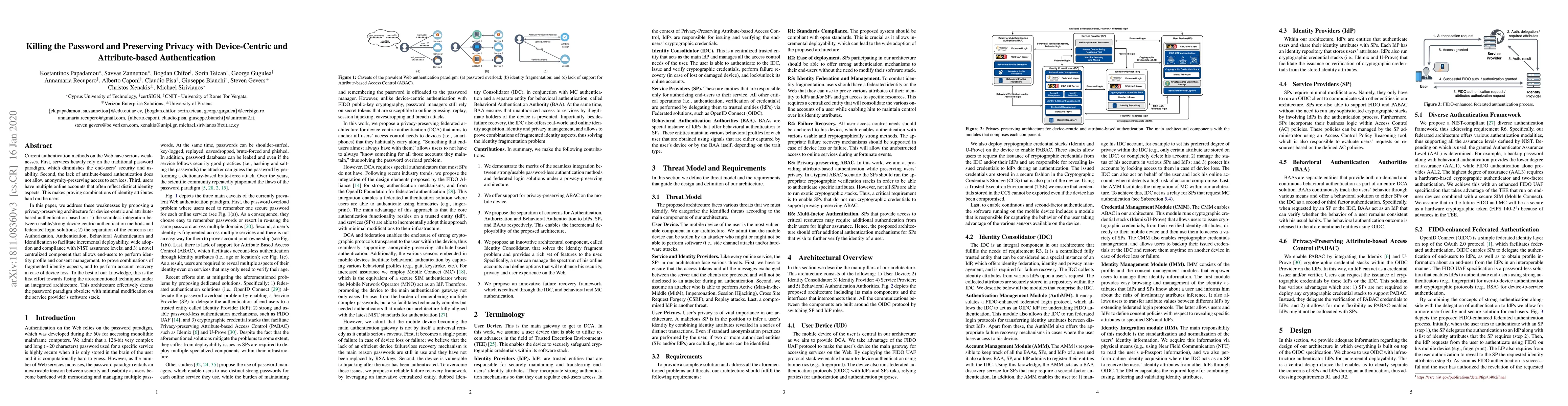 Current authentication methods on the Web have serious weaknesses. First, services heavily rely on the traditional password paradigm, which diminishes the end-users' security and usability. Second, the lack of attribute-based authentication does not allow anonymity-preserving access to services. Third, users have multiple online accounts that often reflect distinct identity aspects. This makes proving combinations of identity attributes hard on the users. In this paper, we address these weaknesses by proposing a privacy-preserving architecture for device-centric and attribute-based authentication based on: 1) the seamless integration between usable/strong device-centric authentication methods and federated login solutions; 2) the separation of the concerns for Authorization, Authentication, Behavioral Authentication and Identification to facilitate incremental deployability, wide adoption and compliance with NIST assurance levels; and 3) a novel centralized component that allows end-users to perform identity profile and consent management, to prove combinations of fragmented identity aspects, and to perform account recovery in case of device loss. To the best of our knowledge, this is the first effort towards fusing the aforementioned techniques under an integrated architecture. This architecture effectively deems the password paradigm obsolete with minimal modification on the service provider's software stack.