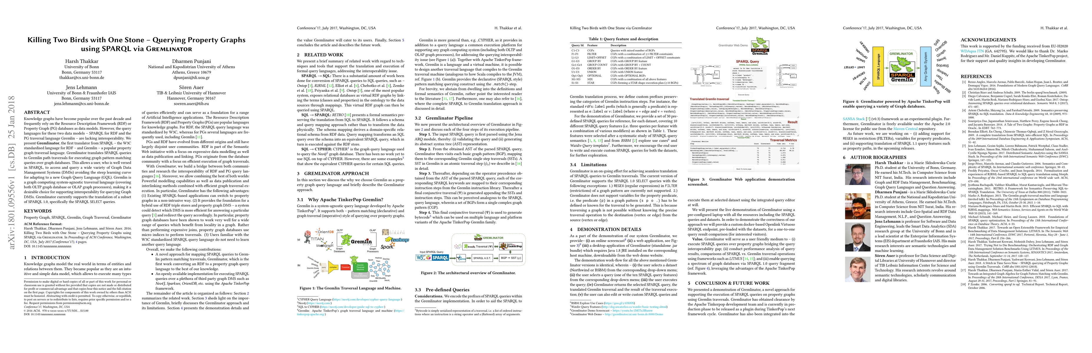 This paper introduces Gremlinator, a translator that enables SPARQL queries to be executed on Property Graph databases using Gremlin. It aims to bridge the gap between RDF and property graph query languages, allowing users to leverage their SPARQL knowledge for querying diverse graph data management systems without learning new query languages.