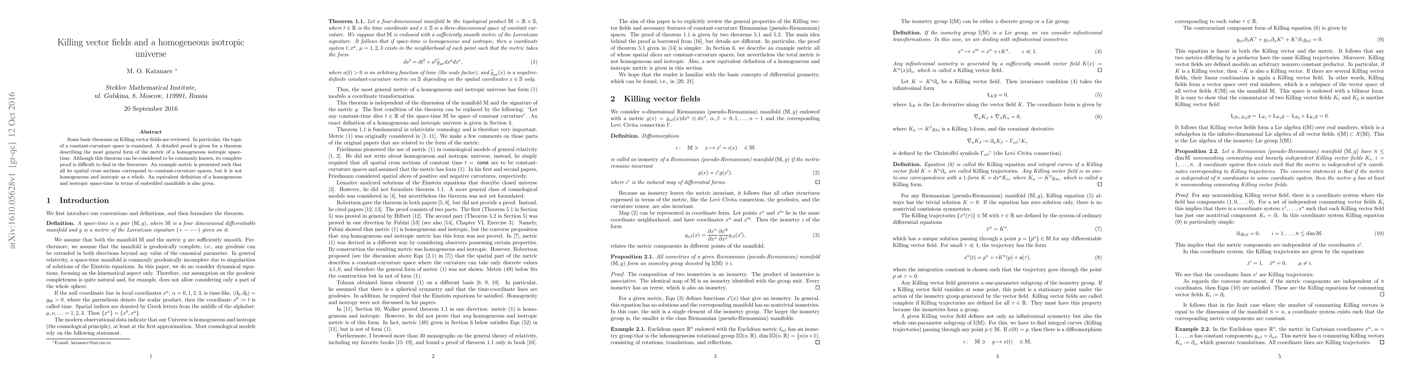 Some basic theorems on Killing vector fields are reviewed. In particular, the topic of a constant-curvature space is examined. A detailed proof is given for a theorem describing the most general form of the metric of a homogeneous isotropic space-time. Although this theorem can be considered to be commonly known, its complete proof is difficult to find in the literature. An example metric is presented such that all its spatial cross sections correspond to constant-curvature spaces, but it is not homogeneous and isotropic as a whole. An equivalent definition of a homogeneous and isotropic space-time in terms of embedded manifolds is also given.