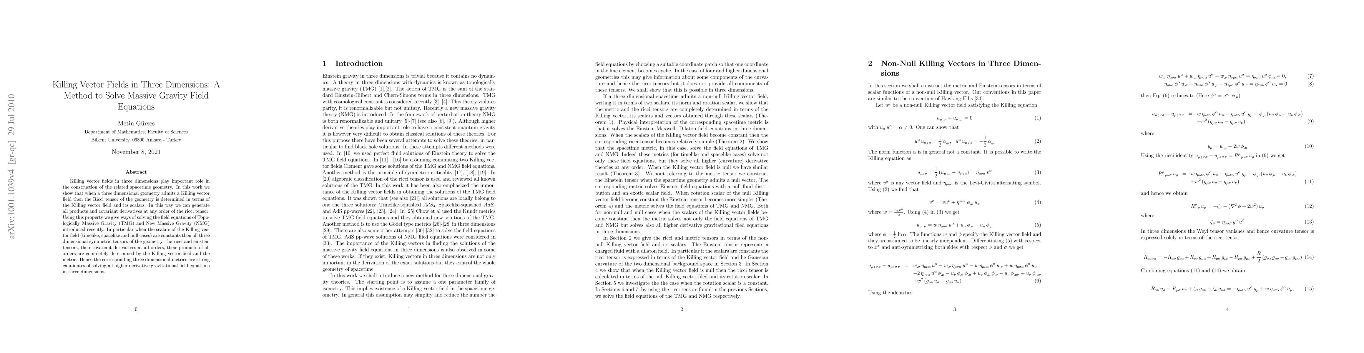Killing vector fields in three dimensions play important role in the construction of the related spacetime geometry. In this work we show that when a three dimensional geometry admits a Killing vector field then the Ricci tensor of the geometry is determined in terms of the Killing vector field and its scalars. In this way we can generate all products and covariant derivatives at any order of the ricci tensor. Using this property we give ways of solving the field equations of Topologically Massive Gravity (TMG) and New Massive Gravity (NMG) introduced recently. In particular when the scalars of the Killing vector field (timelike, spacelike and null cases) are constants then all three dimensional symmetric tensors of the geometry, the ricci and einstein tensors, their covariant derivatives at all orders, their products of all orders are completely determined by the Killing vector field and the metric. Hence the corresponding three dimensional metrics are strong candidates of solving all higher derivative gravitational field equations in three dimensions.