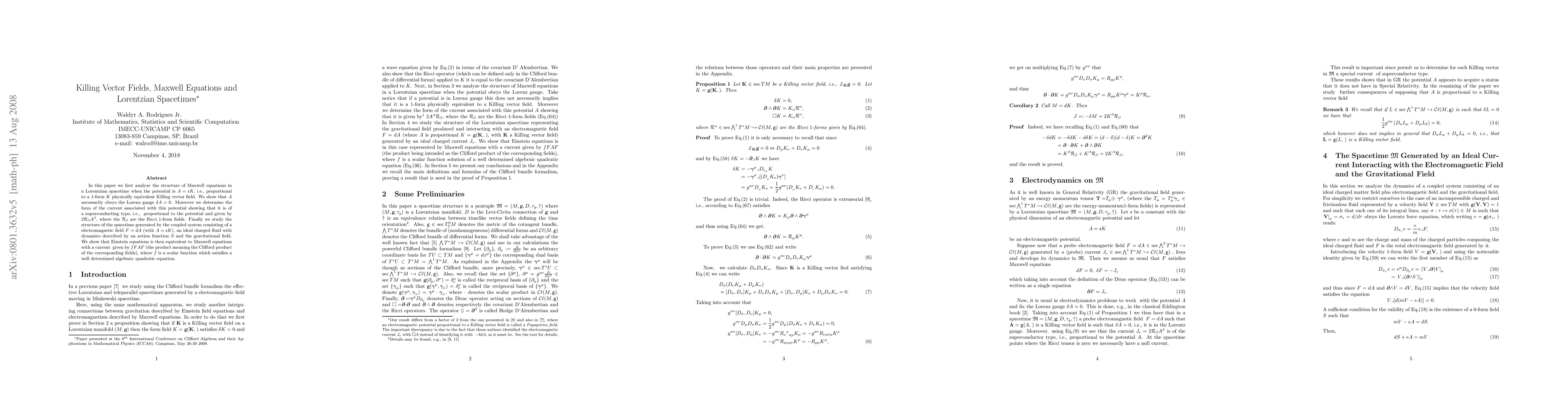 This paper explores Maxwell equations in Lorentzian spacetimes where the electromagnetic potential A is linked to a Killing vector field K. It demonstrates that A satisfies the Lorenz gauge and a wave equation involving the covariant D'Alembertian or Ricci operator, and identifies a superconducting current type. The study also examines the spacetime structure from coupled electromagnetic, charged fluid, and gravitational fields, showing equivalence between Einstein and Maxwell equations under specific conditions.