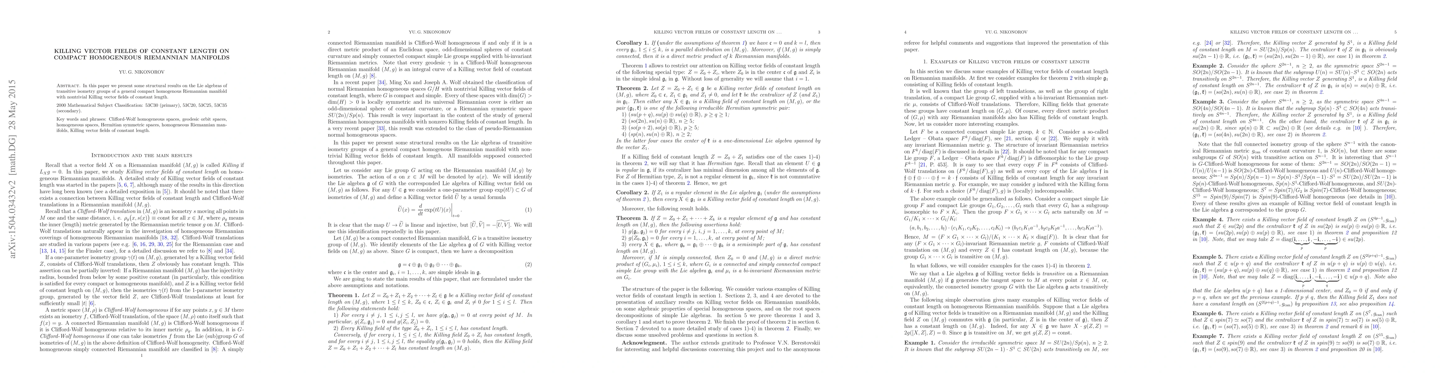 Summary: This paper explores the structural properties of Lie algebras associated with transitive isometry groups on compact homogeneous Riemannian manifolds featuring Killing vector fields of constant length. It reveals insights into the geometric and algebraic characteristics of such manifolds.