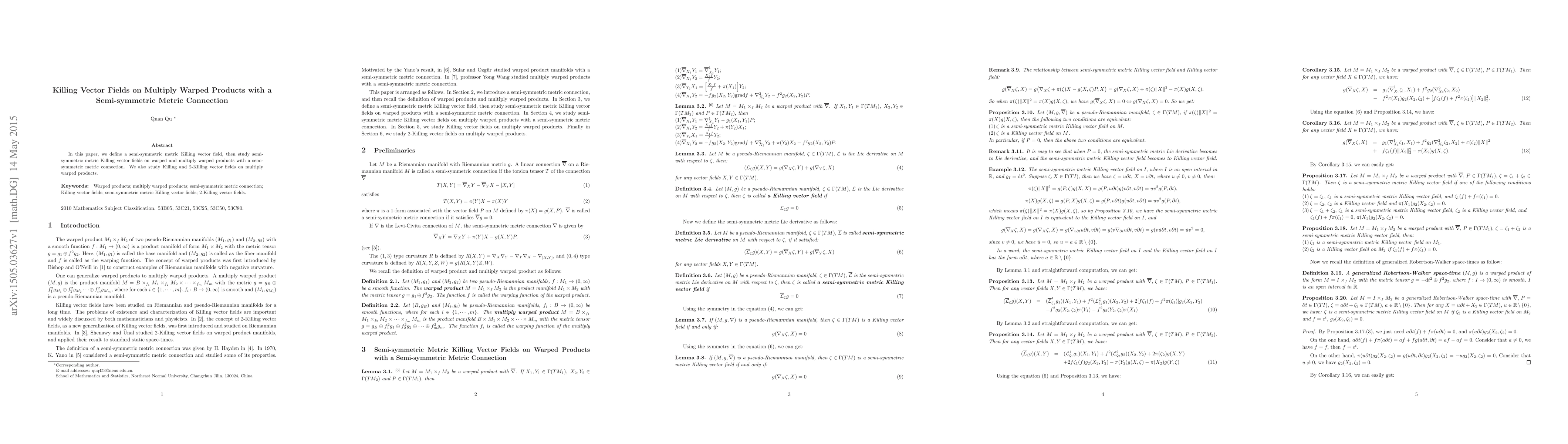 In this paper, we define a semi-symmetric metric Killing vector field, then study semi-symmetric metric Killing vector fields on warped and multiply warped products with a semi-symmetric metric connection. We also study Killing and 2-Killing vector fields on multiply warped products.