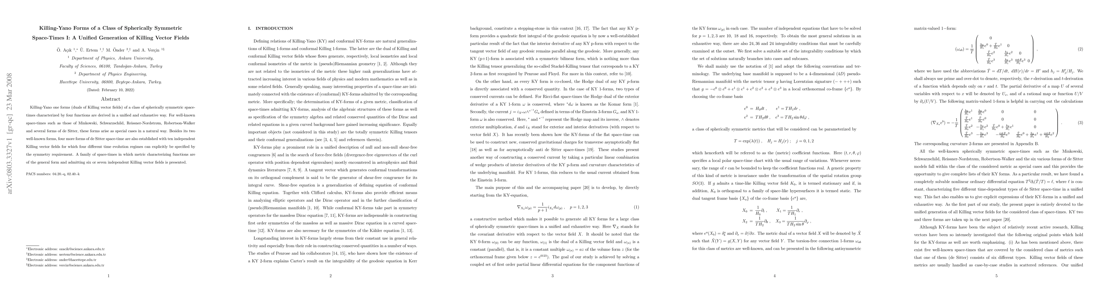 This paper derives Killing-Yano one forms for a class of spherically symmetric space-times characterized by four functions, establishing them for well-known models like Minkowski, Schwarzschild, and Reissner-Nordström. It also introduces four additional forms of de Sitter space-time with ten independent Killing vector fields and specifies four distinct time evolution regimes based on symmetry.