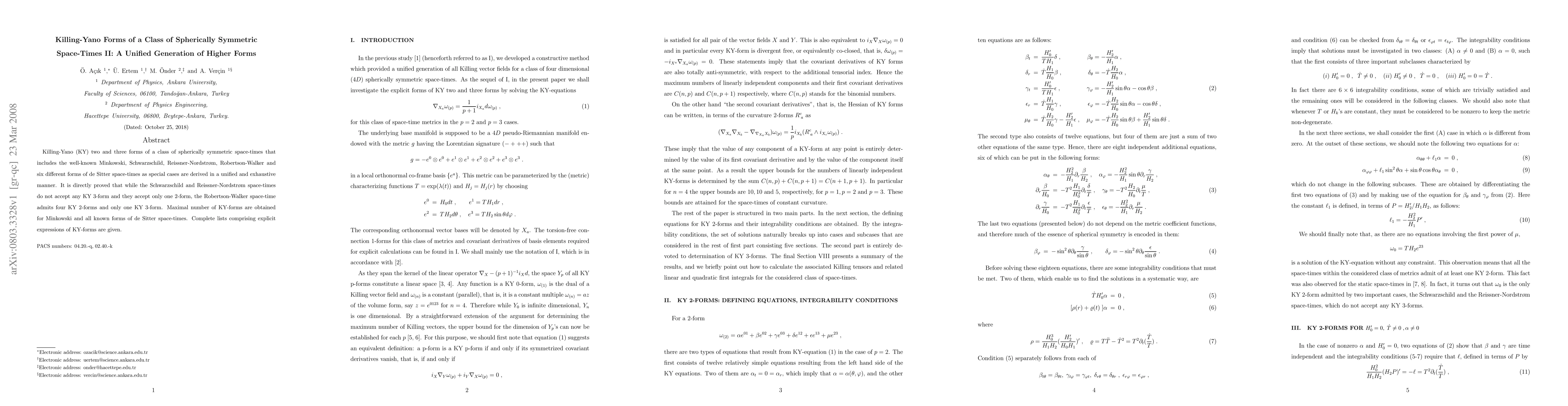 This paper derives Killing-Yano two and three forms for various spherically symmetric space-times, including Minkowski, Schwarzschild, Reissner-Nordstrom, Robertson-Walker, and de Sitter space-times. It finds that Schwarzschild and Reissner-Nordstrom only accept one Killing-Yano two-form, while Robertson-Walker admits four two-forms and one three-form, with Minkowski and de Sitter space-times having the maximal number of forms.