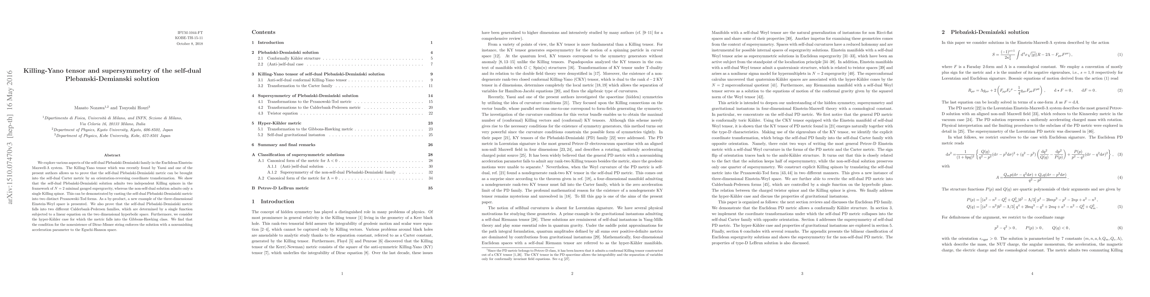 We explore various aspects of the self-dual Pleba\'nski-Demia\'nski family in the Euclidean Einstein-Maxwell-$\Lambda$ system. The Killing-Yano tensor which was recently found by Yasui and one of the present authors allows us to prove that the self-dual Pleba\'nski-Demia\'nski metric can be brought into the self-dual Carter metric by an orientation-reversing coordinate transformation. We show that the self-dual Pleba\'nski-Demia\'nski solution admits two independent Killing spinors in the framework of $N=2$ minimal gauged supergravity, whereas the non-self-dual solution admits only a single Killing spinor. This can be demonstrated by casting the self-dual Pleba\'nski-Demia\'nski metric into two distinct Przanowski-Tod forms. As a by-product, a new example of the three-dimensional Einstein-Weyl space is presented. We also prove that the self-dual Pleba\'nski-Demia\'nski metric falls into two different Calderbank-Pedersen families, which are determined by a single function subjected to a linear equation on the two dimensional hyperbolic space. Furthermore, we consider the hyper-K\"ahler case for which the metric falls into the Gibbons-Hawking class. We find that the condition for the nonexistence of Dirac-Misner string enforces the solution with a nonvanishing acceleration parameter to the Eguchi-Hanson space.