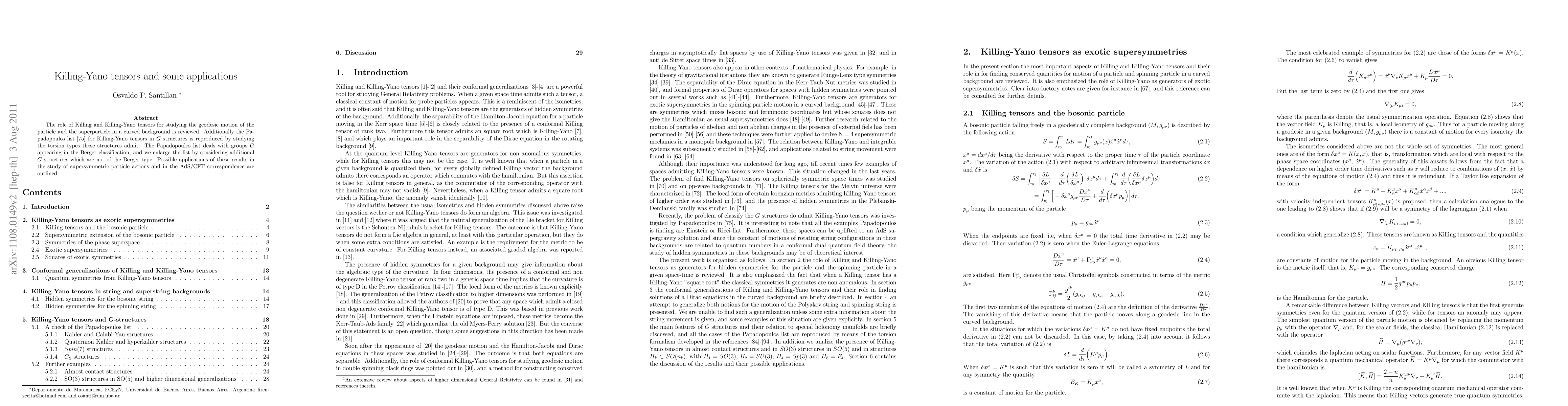 The role of Killing and Killing-Yano tensors for studying the geodesic motion of the particle and the superparticle in a curved background is reviewed. Additionally the Papadopoulos list [74] for Killing-Yano tensors in G structures is reproduced by studying the torsion types these structures admit. The Papadopoulos list deals with groups G appearing in the Berger classification, and we enlarge the list by considering additional G structures which are not of the Berger type. Possible applications of these results in the study of supersymmetric particle actions and in the AdS/CFT correspondence are outlined.