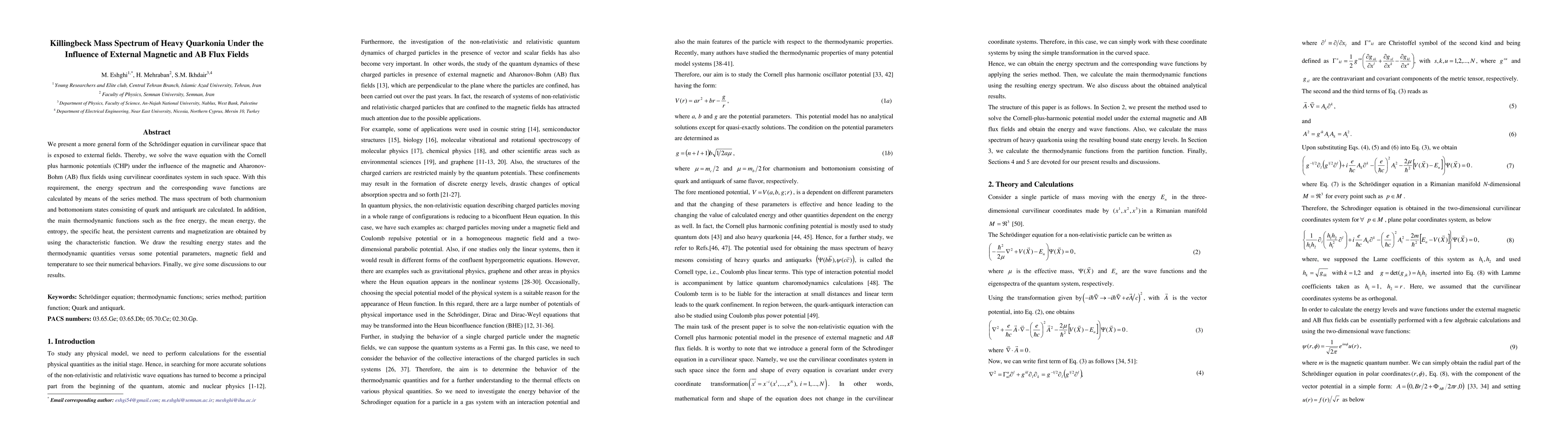 This paper develops a generalized Schrödinger equation in curvilinear space to study the mass spectrum of heavy quarkonia under external magnetic and Aharonov-Bohm flux fields. The Cornell plus harmonic potentials are used to calculate the energy spectrum and thermodynamic functions, revealing their numerical behaviors under varying parameters.