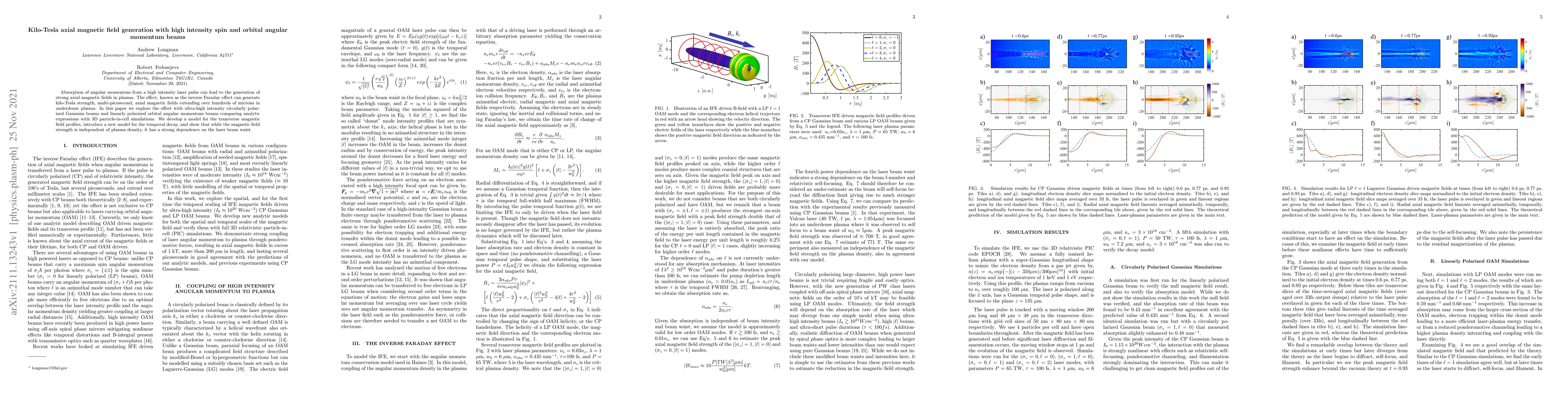 This paper investigates the generation of kilo-Tesla axial magnetic fields via the inverse Faraday effect using high intensity laser beams with spin and orbital angular momentum. The study combines analytic models with 3D simulations to explore the dependence of magnetic field strength on laser beam parameters.