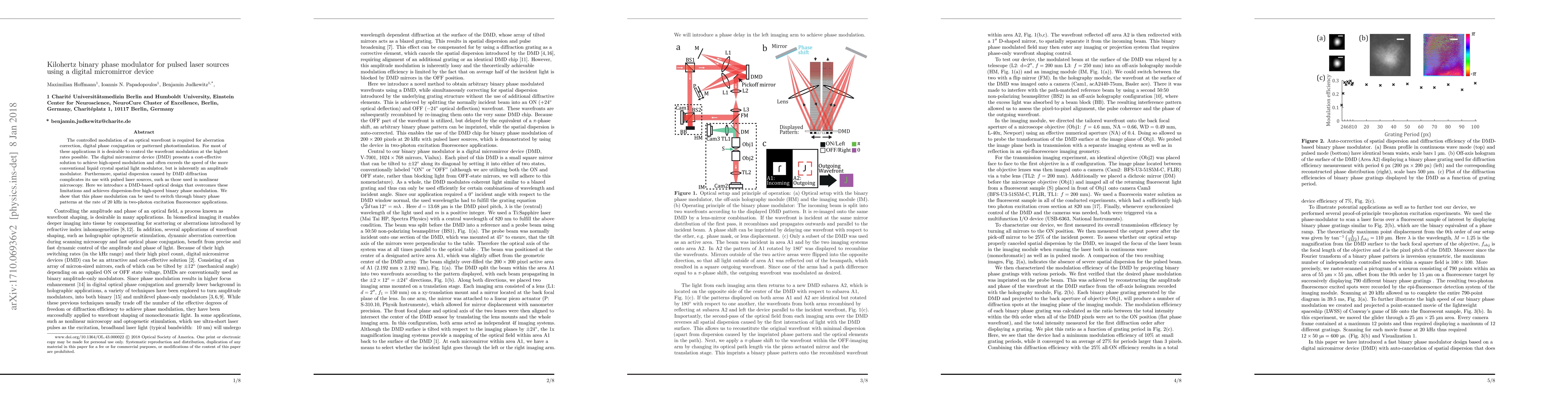 This paper presents a DMD-based design for high-speed binary phase modulation, overcoming spatial dispersion issues for pulsed laser sources. The proposed system enables 20 kHz phase pattern switching, enhancing applications like two-photon excitation fluorescence.